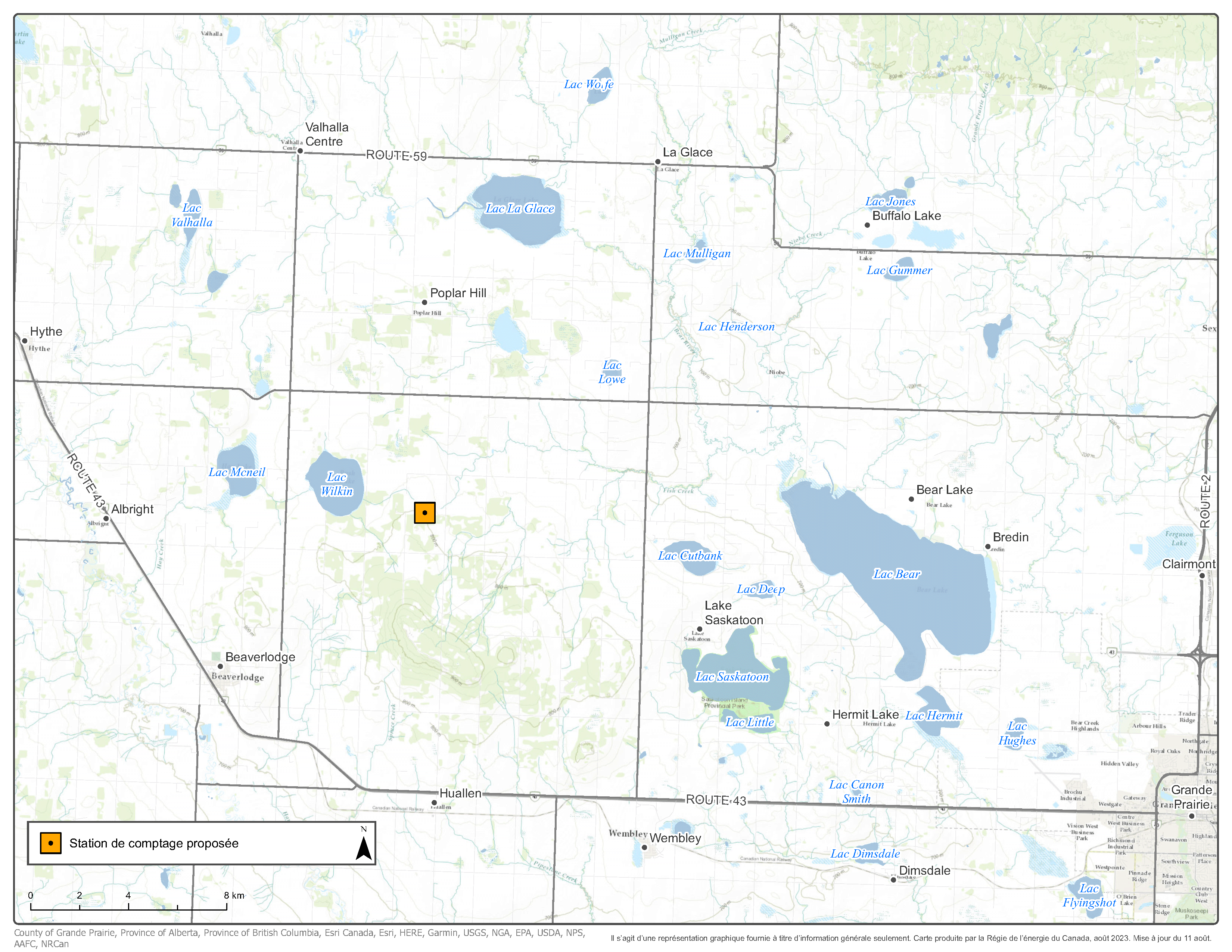 NOVA Gas Transmission Ltd. (« NGTL ») a déposé un avis de projet concernant la station de comptage au point de réception Wilkin Lake. Le projet vise l’aménagement d’une nouvelle station de comptage ultrasonique 884U, d’une protection contre les affouillements et de la tuyauterie s’y rattachant. Le projet sera relié au doublement de la canalisation principale Grande Prairie NPS 30 (tronçon Huallen) de NGTL. Il sera situé dans les limites de la station de comptage au point de vente Wilkin Lake existante de NGTL, sur des terrains loués en tenure franche à SW 34-072-09 W6M, à environ 11 km au nord-est de Beaverlodge, en Alberta, dans le comté de Grande Prairie no 1. Aucun nouveau terrain ne devra être acquis pour la construction du projet et aucune aire de travail temporaire ne devrait être nécessaire.