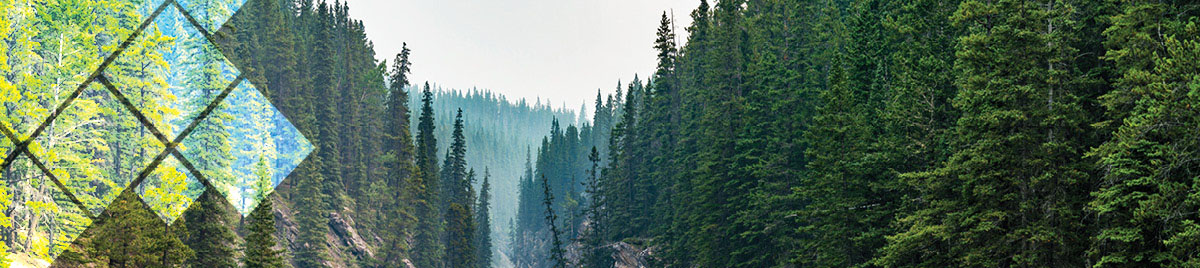 Une rivière qui serpente à travers les rochers et les pins, avec une montagne en arrière-plan.