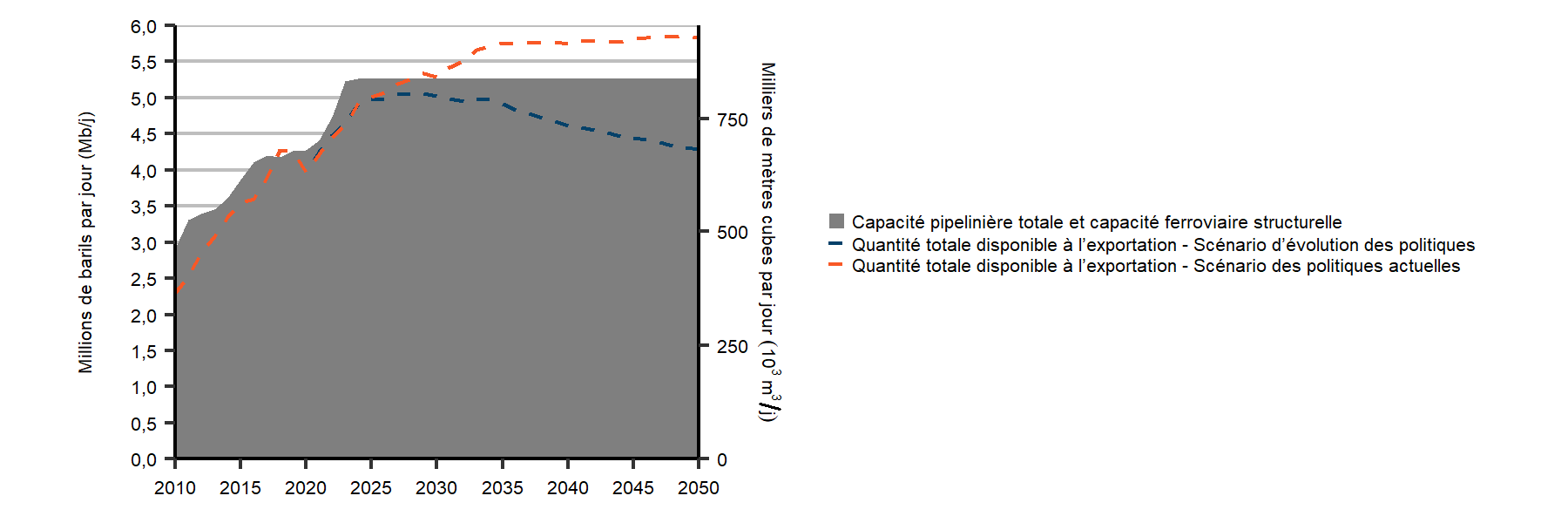 Figure ES.10 – Capacité d’exportation par pipelines et capacité ferroviaire structurelle pour l’exportation en regard de l’approvisionnement total en pétrole brut provenant du BSOC – Scénarios d’évolution des politiques et des politiques actuelles