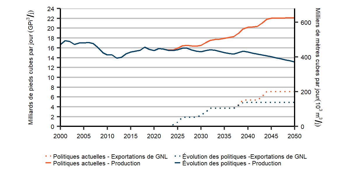 Figure ES.11 – Hypothèses relatives à la production totale de gaz naturel et aux exportations de GNL – Scénarios d’évolution des politiques et des politiques actuelles