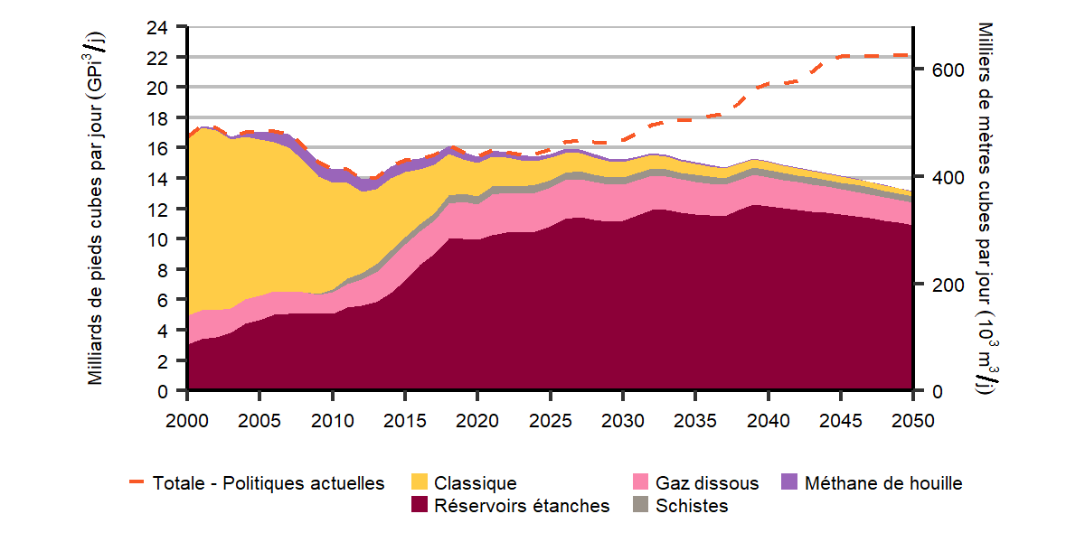 Figure ES.12 – Production de gaz naturel – Scénarios d’évolution des politiques et des politiques actuelles