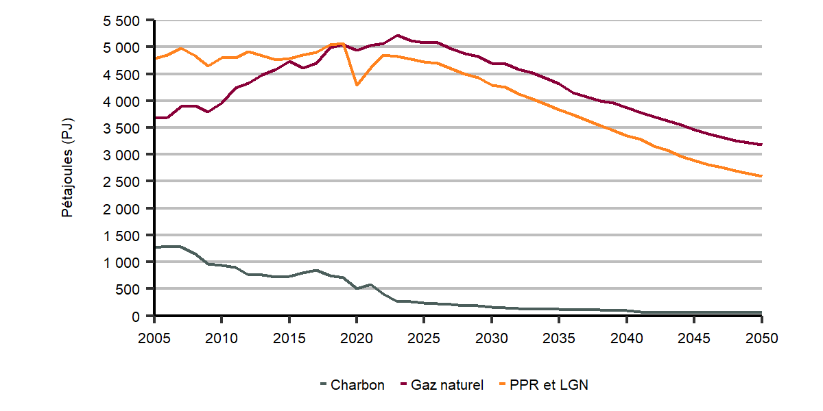 7. À mesure que se poursuit la décarbonation de la filière énergétique du Canada dans le scénario d’évolution des politiques, la consommation de combustibles fossiles diminue. Le charbon devient une composante négligeable du bouquet énergétique et l’utilisation des combustibles dérivés du pétrole diminue, en particulier l’essence et le diesel pour le transport. Après une brève hausse à court terme, la consommation totale de gaz naturel fléchit et, au fil du temps, son exploitation est de plus en plus associée à la technologie de CSC. Les usages industriels, la production d’électricité et la production d’hydrogène provenant du gaz naturel exploité avec le CSC sont des secteurs clés de croissance de la demande.