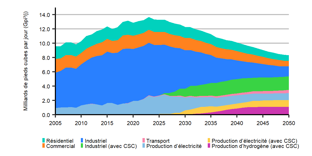 Description : Ce graphique présente la demande totale de gaz naturel selon le secteur dans le scénario d’évolution des politiques. Elle se répartit comme suit : secteur résidentiel : 1,8 à milliards de pieds cubes par jour (« Gpi3/j ») en 2020, 1,4 Gpi3/j  vers 2035 et 0,8 Gpi3/j  vers 2050; secteur industriel : 7,3 Gpi3/j  en 2020, 3,8 Gpi3/j  vers 2035 et 1,4 Gpi3/j  vers 2050; secteur des transports : 0,0 Gpi3/j  en 2020, 0,2 Gpi3/j  vers 2035 et 0,5 Gpi3/j  vers 2050; secteur commercial : 1,9 Gpi3/j  en 2020, 1,5 Gpi3/j  vers 2035 et 0,8 Gpi3/j  vers 2050. demande d’électricité : 1,9 Gpi3/j  en 2020, 1,3 Gpi3/j  vers 2035 et 1,0 Gpi3/j  vers 2050; secteur industriel avec CSC : 0 Gpi3/j  en 2020, 1,7 Gpi3/j  vers 2035 et 1,9 Gpi3/j  vers 2050; production d’électricité avec CSC : 0 Gpi3/j  en 2020, 0,9 Gpi3/j  vers 2035 et 0,9 Gpi3/j  vers 2050; production d’hydrogène avec CSC : 0 Gpi3/j  en 2020, 0,3 Gpi3/j  vers 2035 et 1,1 Gpi3/j  vers 2050.