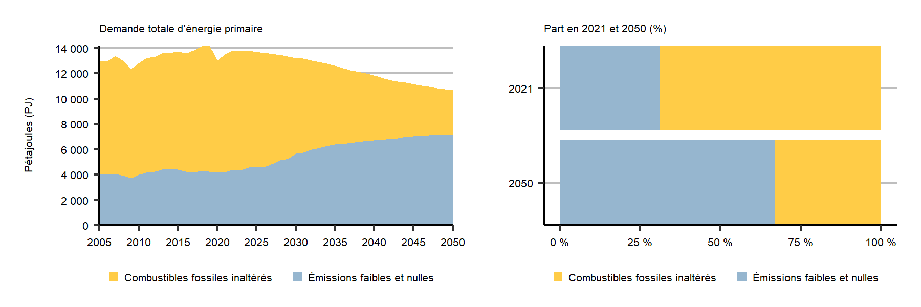 Description : Cette figure comporte deux graphiques. Le premier, à aires empilées, compare la demande d’énergie provenant de sources à faibles émissions et celle tirée des combustibles fossiles inaltérés (sans réduction des émissions) dans le scénario d’évolution des politiques. Les valeurs sur l’axe vertical sont des pétajoules (« PJ »). L’axe horizontal indique les années, de 2005 à 2050. En 2021, la demande d’énergie provenant des combustibles fossiles inaltérés s’élève à environ 9 300 PJ et celle des sources d’énergie à faibles émissions, à quelque 4 200 PJ. À l’horizon 2050, elle se situe, respectivement, autour de 3 500 PJ et de 7 200 PJ. Le second graphique compare la demande d’énergie des sources à faibles émissions à celle provenant des combustibles fossiles inaltérés en 2021 et 2050 dans le scénario d’évolution des politiques. On observe qu’en 2021, la demande d’énergie des premières représente 31 %, tandis qu’elle atteint 66 % en 2050; le reste de la demande est satisfait au moyen de combustibles fossiles inaltérés.
