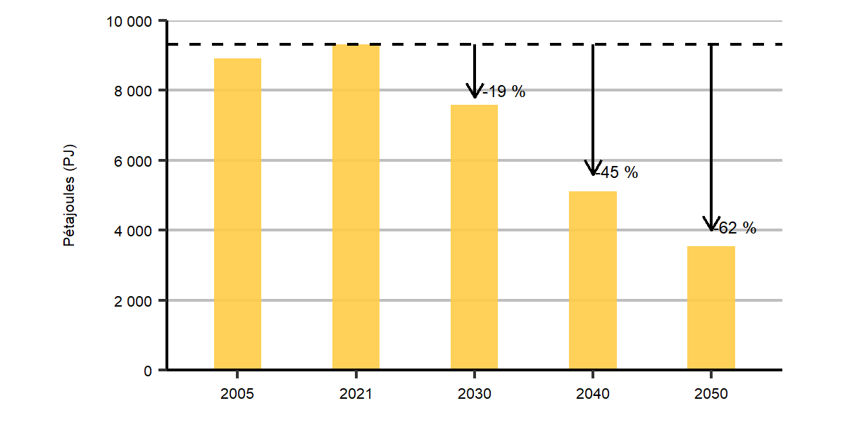Description : Ce graphique à barres illustre la consommation de combustibles fossiles inaltérés en 2005, 2021, 2030, 2040 et 2050. En 2005, elle s’élevait à 8 900 PJ et atteignait 9 300 PJ en 2021. En 2030, elle recule de 19 % par rapport aux niveaux actuels et s’établit à 7 600 PJ. Elle continue de régresser et chute de 45 % sous les niveaux actuels, vers 2040, atteignant 500 PJ. En 2050, enfin, la consommation de combustibles fossiles inaltérés est 62 % plus basse qu’actuellement et s’établit à 3 500 PJ.