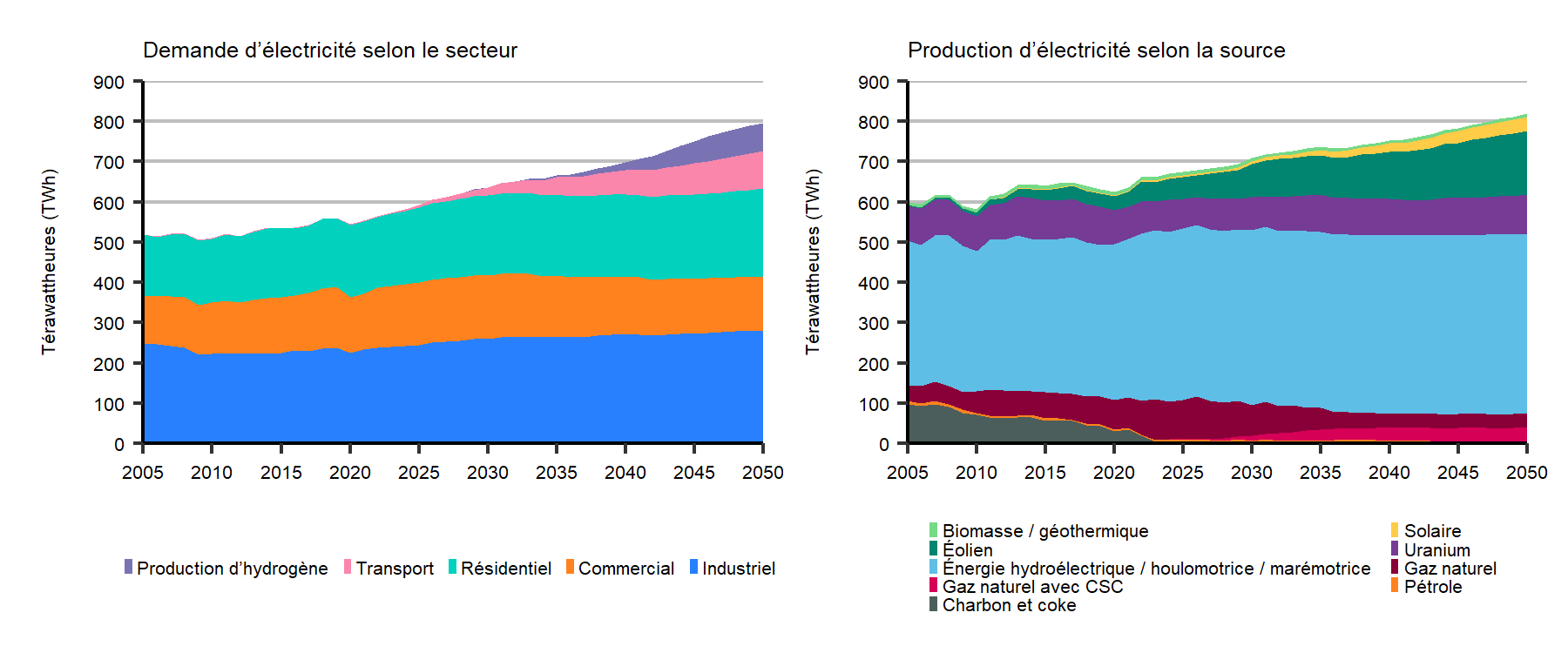 Description : Ce graphique ventile la demande totale d’électricité selon le secteur, de 2019 à 2050 : secteur résidentiel : augmentation, de 171 TWh à 217 TWh; secteur commercial : diminution, de 150 TWh à 134 TWh; secteur industriel : augmentation, de 239 TWh à 280 TWh; secteur des transports : augmentation, de 1 TWh à 93 TWh; secteur de production d’hydrogène : augmentation, de 0 TWh à 90 TWh.