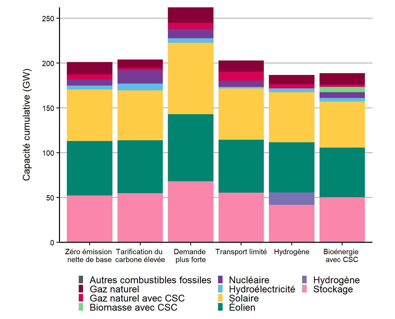 Figure ES.6 – Ajouts cumulatifs de capacité jusqu’en 2050 – Tous les scénarios de production d’électricité carboneutre