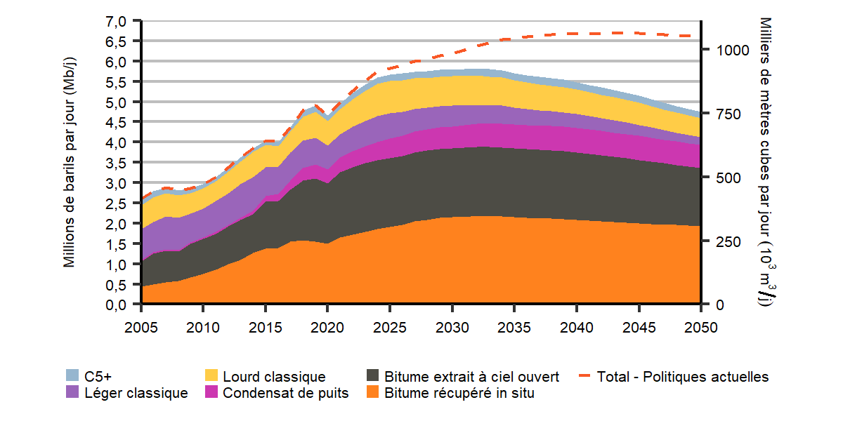 Production tirée des sables bitumineux à partir des installations actuellement en production, d’installations agrandies et de nouvelles installations – Scénario d’évolution des politiques