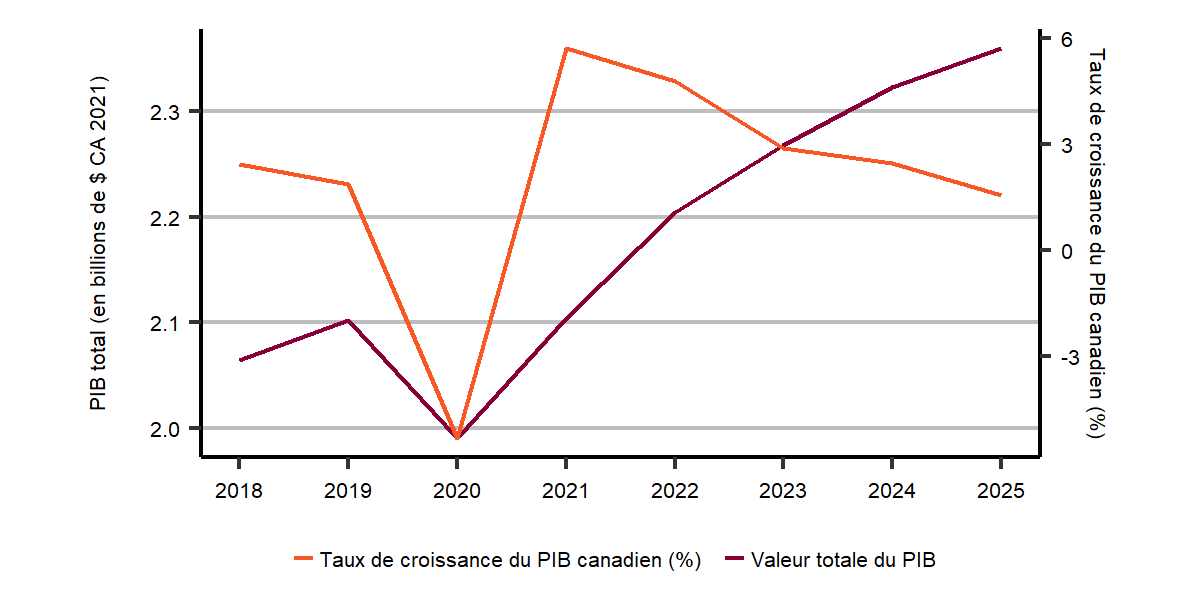 Description : Ce graphique illustre les effets macroéconomiques à court terme de la COVID-19 par l’évolution du PIB réel et de la croissance de celui-ci de 2018 à 2025. Le PIB diminue, passant de 2,10 billions de dollars en 2019 à 1,99 billion de dollars en 2020, une baisse de 5,3 %. En 2021 et en 2022, on observe une hausse du PIB, qui passe à 2,10 billions de dollars et 2,20 billions de dollars, respectivement. Cela correspond à une croissance de 5,7 % en 2021 et de 4,8 % en 2022.
