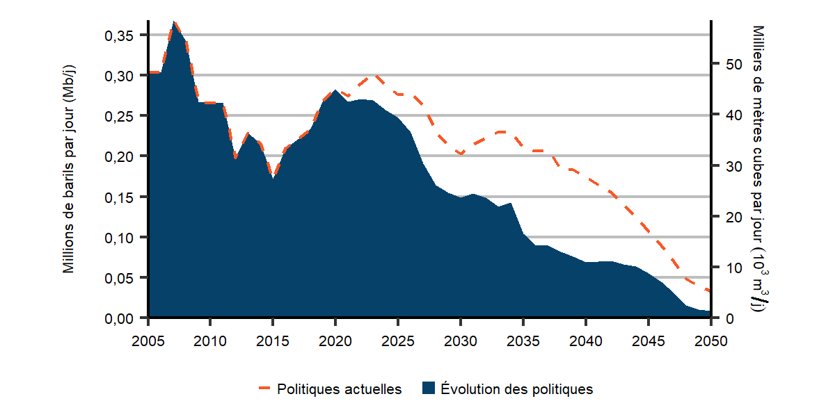 Figure R.8 – Culmination de la production totale de pétrole brut en 2032, puis diminution jusqu’en 2050, dans le scénario d’évolution des politiques