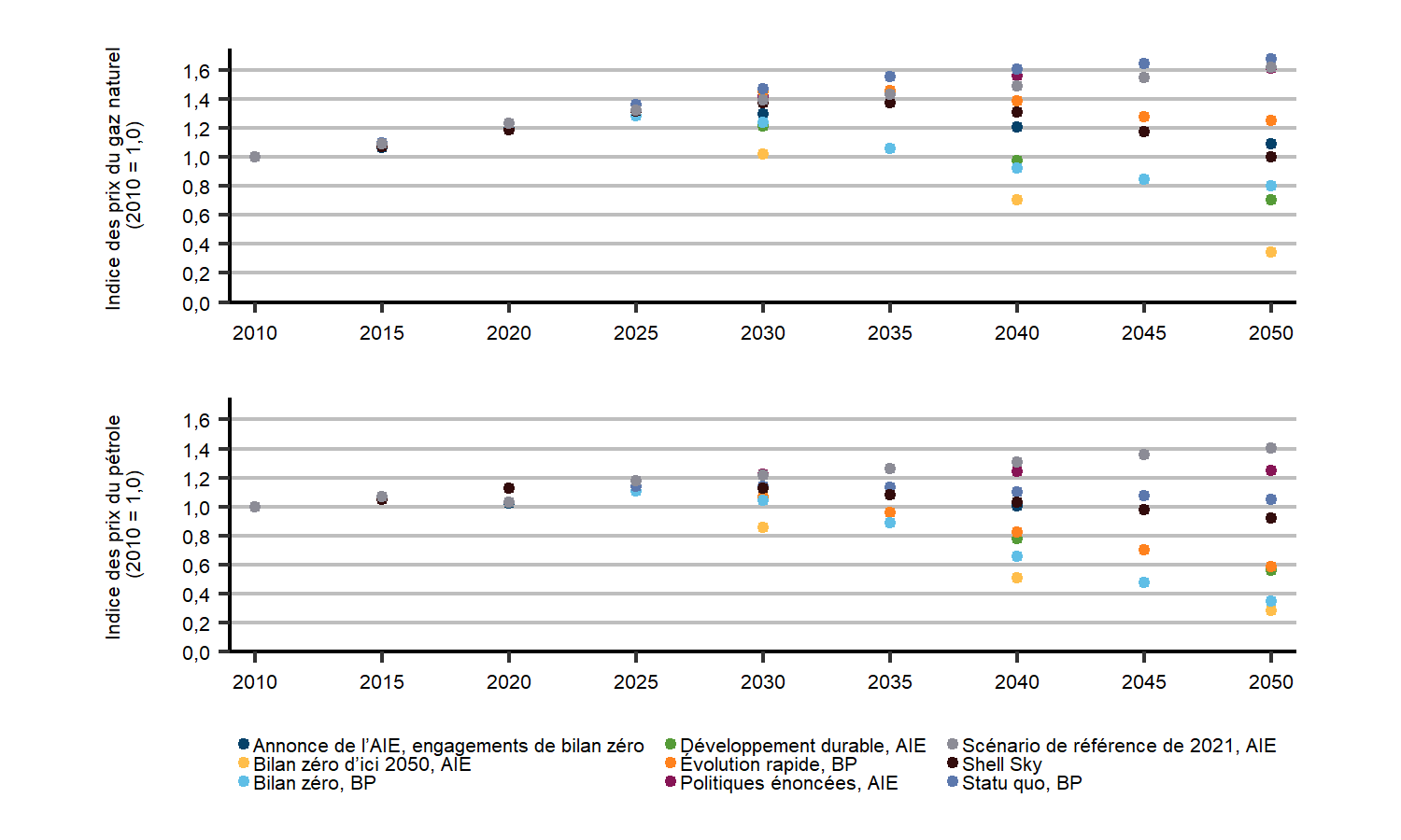 Les tendances de la demande de combustibles fossiles inaltérés dans le scénario d’évolution des politiques, illustrées dans la présente section, reposent sur une forte réduction des émissions de GES. Il en ressort aussi qu’il est improbable que ce scénario permettra d’atteindre zéro émission nette à l’horizon 2050. Dans cette optique, une section intitulée « Vers un bilan zéro » a été ajoutée au présent rapport.
