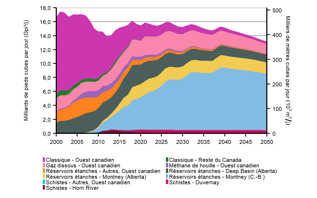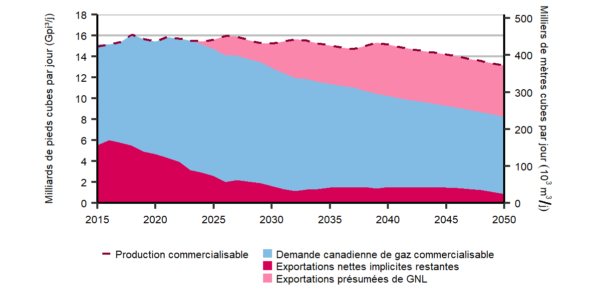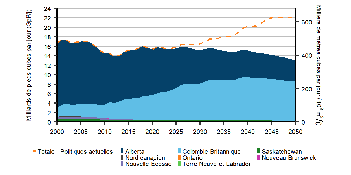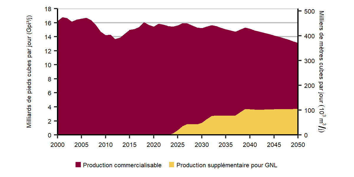 Dans le scénario des politiques actuelles, l’approvisionnement en produit dépasse la capacité pipelinière pendant la majeure partie de cette même période. Cela dénote de façon manifeste qu’en l’absence d’une capacité pipelinière additionnelle, la production serait limitée sous les seuils projetés.