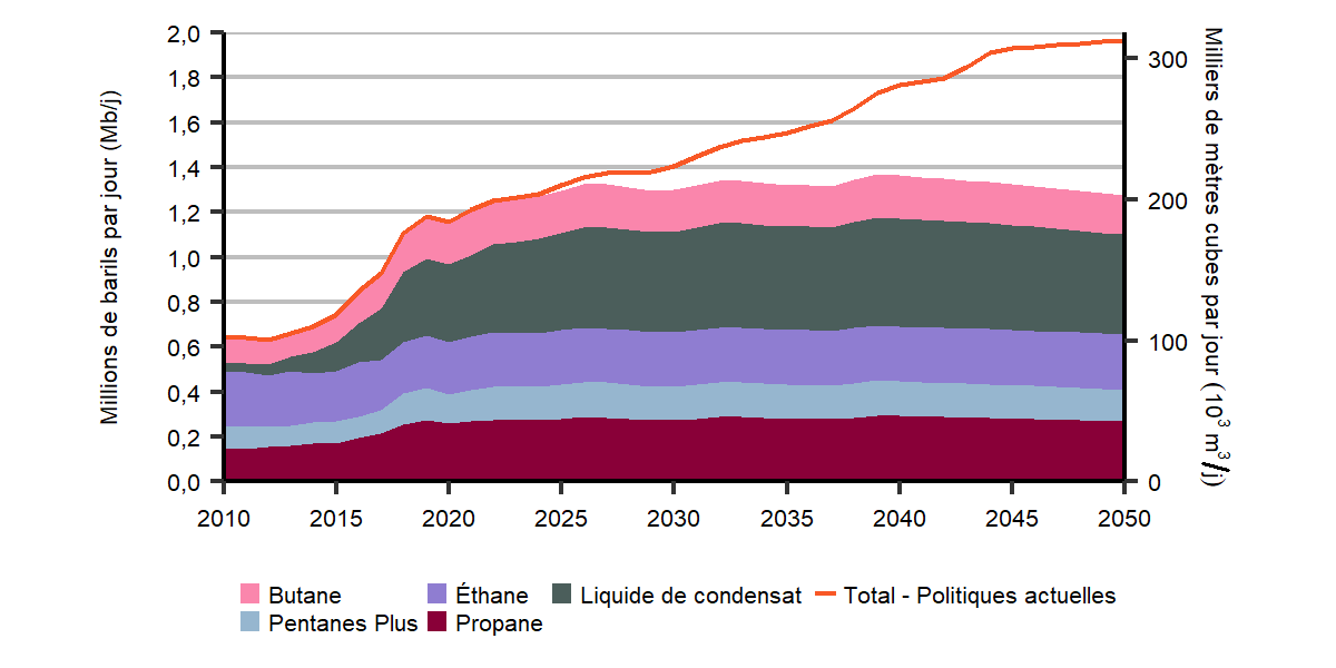 Description : Le graphique illustre la production totale de liquides de gaz naturel (« LGN ») dans le scénario d’évolution des politiques, de 2010 à 2050. La production totale augmente, de 640 milliers de barils par jour (« kb/j ») en 2010 à 197 kb/j en 2050. La hausse est essentiellement attribuable à la production de condensats liquides, qui, de 40 kb/j en 2010, atteint 450 kb/j en 2050.