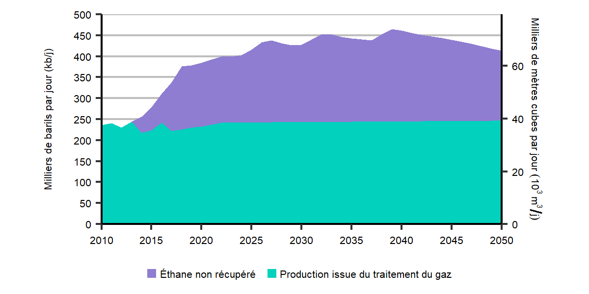 Description : Ce graphique illustre la production d’éthane à partir du traitement du gaz naturel et d’éthane non récupéré, de 2010 à 2050. La production d’éthane issue du traitement du gaz s’établit comme suit : 236 Mb/j en 2010, 233 Mb/j en 2020 et 246 Mb/j en 2050. Celle de l’éthane non récupéré est la suivante : 0 Mb/j en 2010, 151 Mb/j en 2020 et 167 Mb/j en 2050.