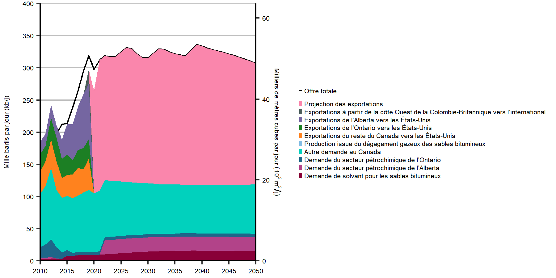 Description : Ce graphique montre la production totale de propane en fonction de son utilisation, de 2010 à 2050, et se décline comme suit : exportations projetées : 160 milliers de barils par jour (« kb/j ») en 2020, 203 kb/j en 2035 et 188 kb/j en 2050; demande de solvants pour les sables bitumineux : 9 kb/j en 2020 et 15 kb/j en 2035 et 2050; demande du secteur pétrochimique en Alberta : 0 kb/j en 2020 et 22 kb/j en 2035 et 2050; demande du secteur pétrochimique en Ontario : 9 kb/j en 2020, 76 kb/j en 2035 et 77 kb/j en 2050; autre demande au Canada : 91 kb/j en 2020, 76 kb/j en 2035 et 77 kb/j en 2050; approvisionnement total : 265 kb/j en 2020, 332 kb/j en 2035 et 307 kb/j en 2050.