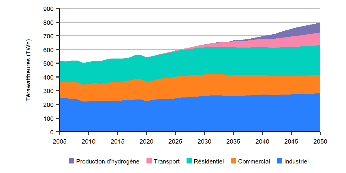 Description : Ce graphique ventile la demande totale d’électricité selon le secteur, de 2019 à 2050 : secteur résidentiel : augmentation, de 171 TWh à 217 TWh; secteur commercial : diminution, de 150 TWh à 134 TWh; secteur industriel : augmentation, de 239 TWh à 280 TWh; secteur des transports : augmentation, de 1 TWh à 93 TWh; secteur de production d’hydrogène : augmentation, de 0 TWh à 90 TWh.
