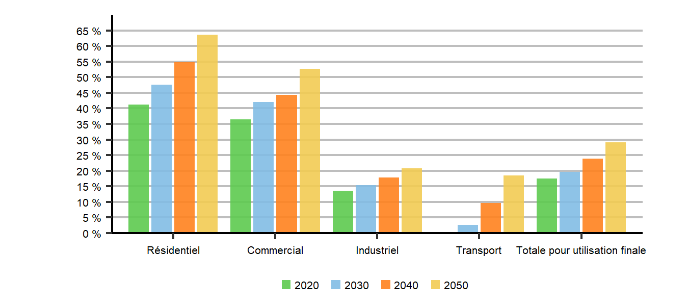 Figure R.24 – Part de la demande d’électricité pour utilisation finale selon le secteur et total dans le scénario d’évolution des politiques