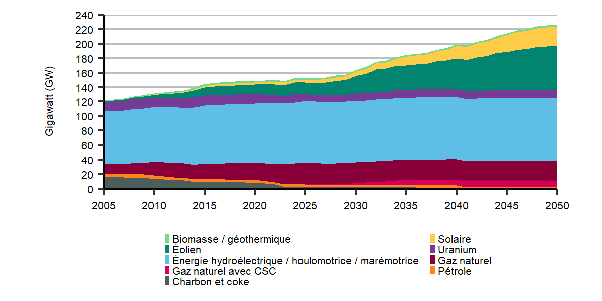Description : Ce graphique à aires empilées montre la capacité de production d’électricité selon le type de combustible de 2005 à 2050 dans le scénario d’évolution des politiques. Elle se ventile de la sorte : capacité totale : augmentation, de 149 gigawatts (« GW ») en 2020 à 226 GW en 2050; biomasse et géothermie : augmentation, de 2 GW en 2020 à 3 GW en 2050; solaire : augmentation, de 3 GW en 2020 à 27 GW en 2050. éolien : augmentation, de 14 GW en 2020 à 61 GW en 2050; uranium : diminution, de 13 GW en 2020 à 12 GW en 2050; énergies hydroélectrique / houlomotrice / marémotrice : augmentation, de 81 GW en 2020 à 86 GW en 2050; gaz naturel : augmentation, de 24 GW en 2020 à 27 GW en 2050; gaz naturel avec CSC : augmentation, de 0 GW en 2020 à 9 GW en 2050; pétrole : diminution de 4 GW en 2020 à 2 GW en 2050; charbon et coke : diminution de 8,5 GW en 2020 à 0 GW en 2050.