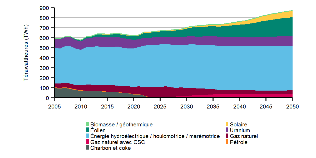 Description : Ce graphique à aires empilées montre la production d’électricité selon le type de combustible en 2020 et en 2050 dans le scénario d’évolution des politiques. Elle se présente comme suit : production totale : augmentation, de 624 térawattheures (« TWh ») à 819 TWh; biomasse et géothermie : inchangée à 8 TWh durant la période; solaire : augmentation, de 2 TWh en à 35 TWh; éolien : augmentation de 35 TWh à 159 TWh; uranium : augmentation, de 83 TWh à 96 TWh. énergies hydroélectrique / houlomotrice / marémotrice : augmentation, de 386 TWh à 446 TWh; gaz naturel : diminution, de 74 TWh à 36 TWh; gaz naturel avec CSC : augmentation, de nulle à 33 TWh; pétrole : augmentation, de 4 TWh à 6 TWh; charbon et coke : diminution, de 31 TWh à 0 TWh.