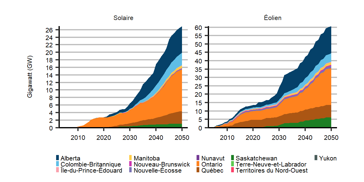 L’essor des énergies renouvelables autres qu’hydroélectriques s’explique par la baisse des coûts, des avancées technologiques et une meilleure intégration des sources d’énergie renouvelable variable (« ERV »)Définition *, comme l’éolien et le solaire. La figure R.27 révèle que d’ici 2050, diverses régions du Canada ajouteront une capacité éolienne et solaire. Ainsi, la capacité totale de production de l’éolien augmente à 57 gigawatts (« GW ») et celle du solaire, à 26 GW. Après 2030, le solaire est la forme d’énergie renouvelable qui connaît l’essor le plus rapide.