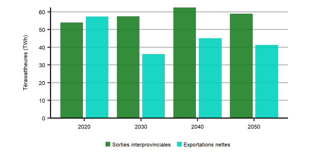 Description : Ce graphique illustre le commerce interprovincial et international d’électricité en 2020, 2030, 2040 et 2050 dans le scénario d’évolution des politiques. Il se détaille comme suit : Débits sortants interprovinciaux : 50,9 TWh en 2020, 57,4 TWh en 2030, 62,4 TWh en 2040 et 58,9 TWh en 2050. Exportations nettes : 57,3 TWh en 2020, 36,2 TWh en 2030, 45,1 TWh en 2040 et de 41,3 TWh en 2050.