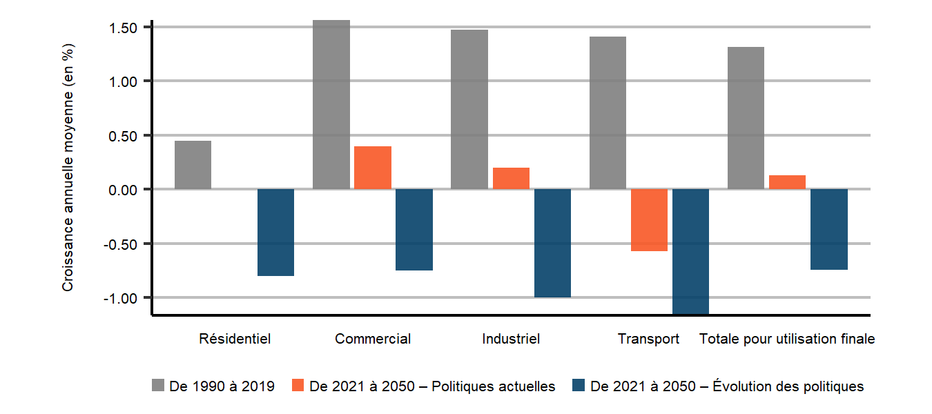 Description : Ce graphique illustre la demande totale d’énergie pour utilisation finale selon le secteur de 2019 à 2050 dans le scénario d’évolution des politiques et celui des politiques actuelles. Elle s’établit comme suit : secteur résidentiel : diminution de 0,8 % (évolution des politiques), inchangée (politiques actuelles); secteur commercial : diminution de 0,8 % (évolution des politiques), augmentation de 0,4 % (politiques actuelles); secteur industriel : diminution de 1,0 % (évolution des politiques), augmentation de 0,2 % (politiques actuelles); secteur des transports : diminution de 1,2 % (évolution des politiques) et de 0,6 % (politiques actuelles); demande totale pour utilisation finale : diminution de 0,7 % (évolution des politiques), augmentation de 0,1 % (politiques actuelles).