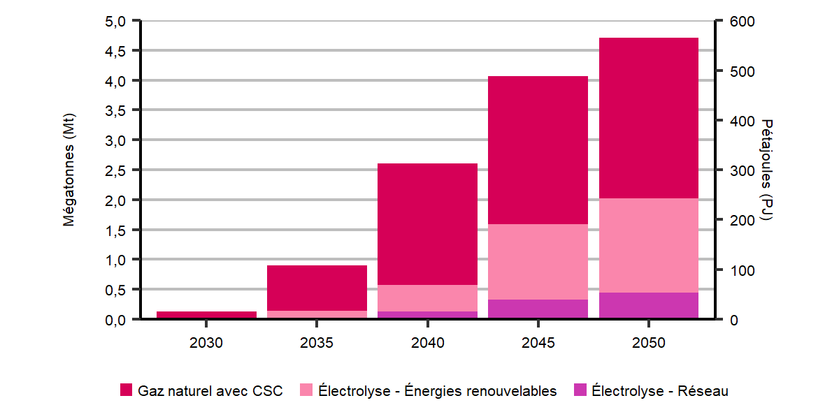 Description : Ce graphique montre la production d’hydrogène selon la technique employée en 2030, 2035, 2040, 2045 et 2050 dans le scénario d’évolution des politiques : 2030 – gaz naturel avec CSC : 0,1 mégatonne (« Mt »); électrolyse, énergies renouvelables : 0,01 Mt; électrolyse, réseau : 0,003 Mt. 2035 – gaz naturel avec CSC : 0,75 Mt; électrolyse, énergies renouvelables : 0,12 Mt; électrolyse, réseau : 0,03 Mt. 2040 – gaz naturel avec CSC : 2,03 Mt; électrolyse, énergies renouvelables : 0,45 Mt; électrolyse, réseau : 0,13 Mt. 2045 – gaz naturel avec CSC : 2,48 Mt; électrolyse, énergies renouvelables : 1,26 Mt; électrolyse, réseau : 0,33 Mt. 2050 – gaz naturel avec CSC : 2,54 Mt; électrolyse, énergies renouvelables : 1,58 Mt; électrolyse, réseau : 0,44 Mt.