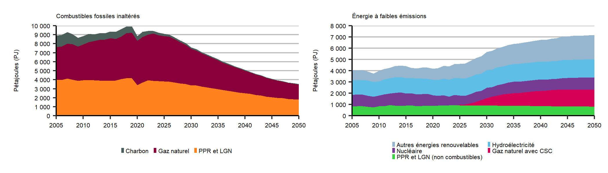 Description : Cette figure comporte deux graphiques. Le premier présente la demande primaire de combustibles fossiles inaltérés, de 2005 à 2050 : charbon : 936 pétajoules (« PJ ») en 2010, 160 PJ en 2030 et 58 PJ vers 2050; gaz naturel : 3 957 PJ en 2010, 4 033 PJ en 2030 et 1 669 PJ en 2050; produits pétroliers raffinés (« PPR ») et liquides de gaz naturel (« LGN ») : 3 953 PJ en 2010, 902 PJ en 2030 et 1 788 PJ en 2050. Le second graphique montre la demande primaire de combustibles à faibles émissions : charbon : 1 254 PJ en 2010, 1 564 PJ en 2030 et 1 607 PJ vers 2050; nucléaire : 955 PJ en 2010, 916 PJ en 2030 et 1 073 PJ en 2050; gaz naturel avec CSC : 0 PJ en 2010, 667 PJ en 2030 et 1 512 PJ en 2050; PPR et LGN, autres que pour combustion : 0 PJ en 2010, 902 PJ en 2030 et 814 PJ en 2050; autres énergies renouvelables : 931 PJ en 2010, 1 601 PJ en 2030 et 2 144 PJ en 2050.