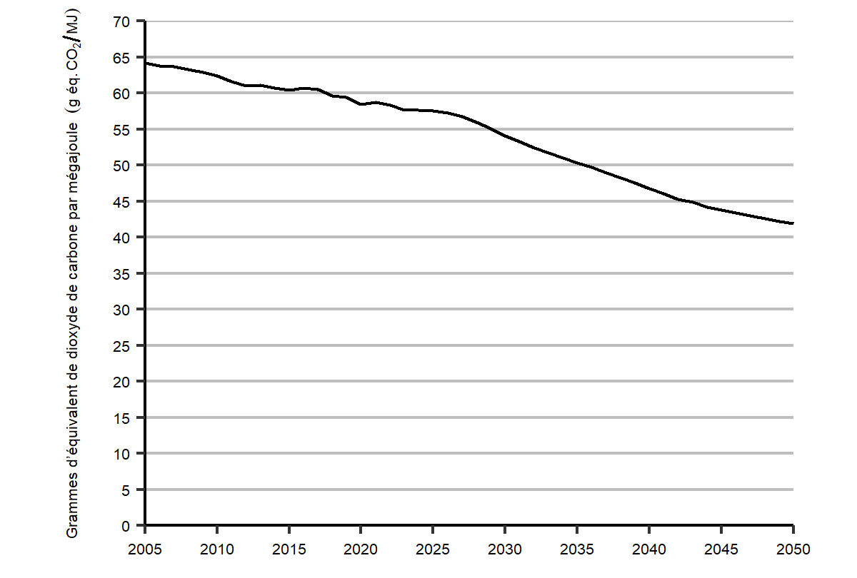 Description : Ce graphique montre l’intensité des émissions de CO2 de 2005 à 2050 en grammes d’équivalent de dioxyde de carbone par mégajoule (« g éq. CO2/MJ »). En 2005, l’intensité des émissions s’élevait à 64 g d’éq.2/MJ. Cette intensité a diminué à 60 g d’éq.2/MJ en 2018 et s’établit à 42 g d’éq.2/MJ en 2050.