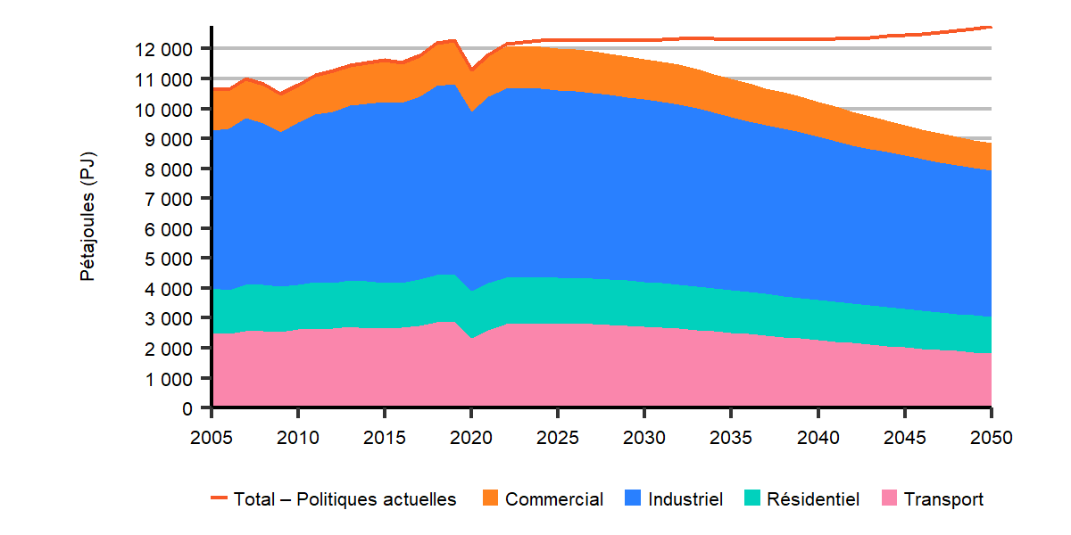Description : Ce graphique illustre la demande totale d’énergie pour utilisation finale selon le secteur de 2005 à 2050 dans le scénario d’évolution des politiques. Elle s’établit comme suit : secteur résidentiel : diminution, de 1 600 pétajoules (« PJ ») en 2019 à 1 233 PJ en 2050; secteur industriel : diminution, de 6 338 PJ en 2019 à 4 881 PJ en 2050; secteur commercial : diminution, de 1 473 PJ en 2019 à 921 PJ en 2050; secteur des transports : diminution, de 2 880 PJ en 2019 à 1 821 PJ en 2050.