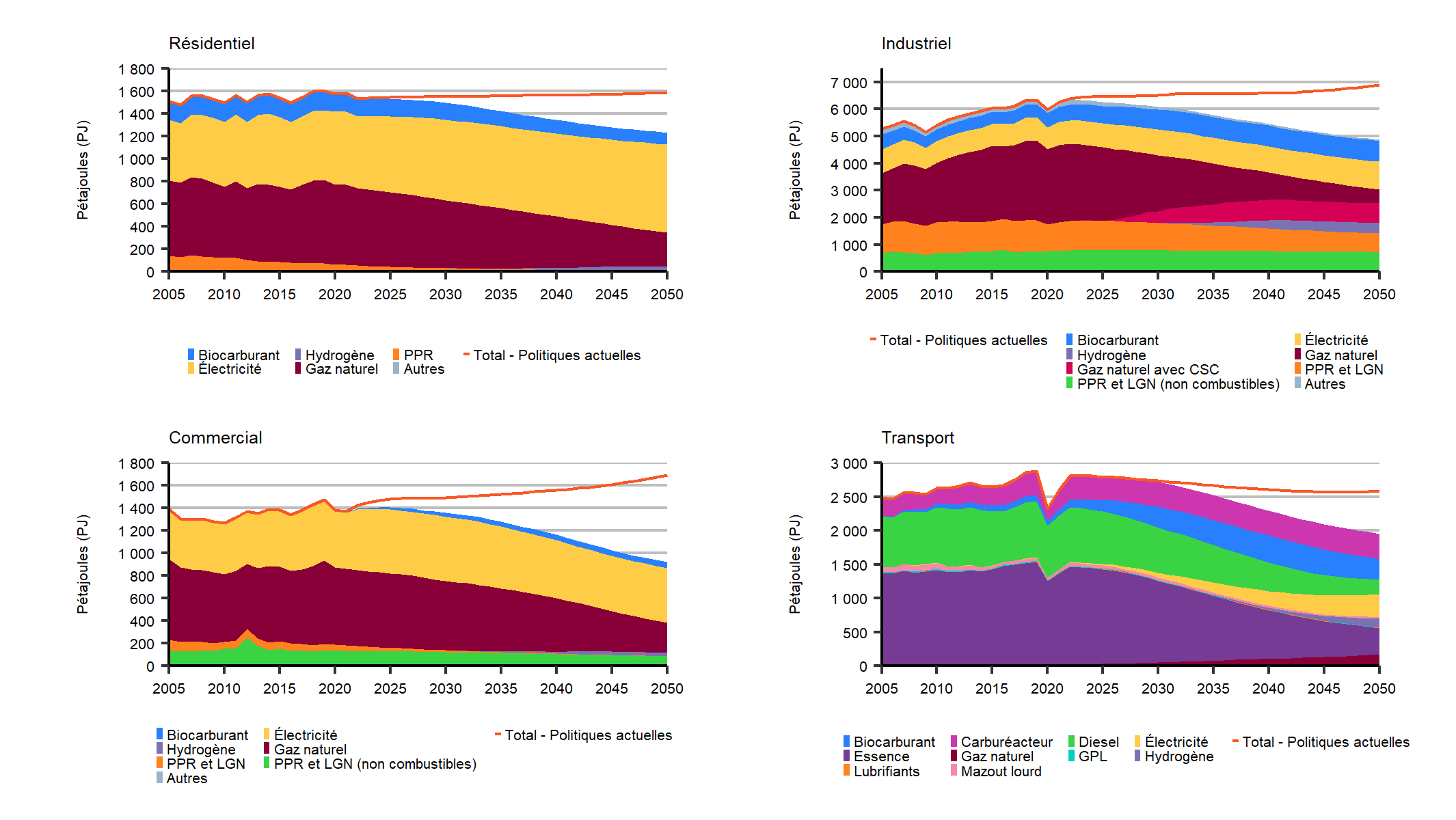 Secteur des transports – diminution de la demande d’essence, de 1 535 PJ en 2019 à 386 PJ en 2050; diminution de la demande de diesel, de 831 PJ en 2019 à 218 PJ en 2050; augmentation de la demande de carburéacteur, de 353 PJ en 2019 à 374 PJ en 2050; augmentation de la demande de biocombustibles, de 92 PJ en 2019 à 303 PJ en 2050; augmentation de la demande d’hydrogène, de 0 PJ en 2019 à 22 PJ en 2050; augmentation de la demande d’électricité, de 4 PJ en 2019 à 337 PJ en 2050; diminution de la demande de mazout lourd, de 45 PJ en 2019 à 22 PJ en 2050; diminution de la demande de GPL, de 12 PJ en 2019 à 2 PJ en 2050; diminution de la demande de lubrifiants, de 3 PJ en 2019 à 4 PJ en 2050; augmentation de la demande de gaz naturel, de 5 PJ à 175 PJ en 2050.