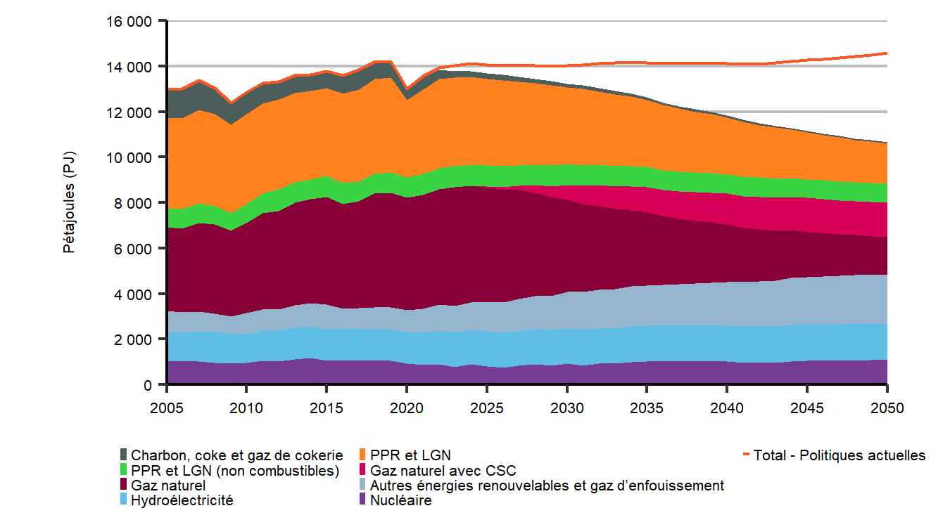 Description : Ce graphique ventile la demande d’énergie primaire dans le scénario des politiques actuelles, selon le combustible, tout au long de la période de projection. On y voit aussi la demande primaire totale d’énergie dans le scénario des politiques actuelles. Dans le scénario d’évolution des politiques, la demande s’établit comme suit : diminution de la demande de charbon, de coke et de gaz de cokerie, de 713 pétajoules (« PJ ») en 2019 à 58 PJ en 2050; diminution de la demande de produits pétroliers raffinés (« PPR »), de 5 067 PJ en 2019 à 2 601 PJ en 2050; diminution de la demande de gaz naturel, de 5 045 PJ en 2019 à 1 512 PJ en 2050; augmentation de la demande d’hydroélectricité, de 1 353 PJ en 2019 à 1 607 PJ en 2050; augmentation de la demande d’électricité produite au moyen du nucléaire, de 1 057 PJ en 2019 à 1 073 PJ en 2050; augmentation de la demande des autres ressources renouvelables et de gaz d’enfouissement, de 984 PJ en 2019 à 2 148 PJ en 2050; diminution de la demande primaire totale, de 14 219 PJ en 2019 à 10 668 PJ en 2050, et augmentation à 14 567 PJ dans le scénario des politiques actuelles.