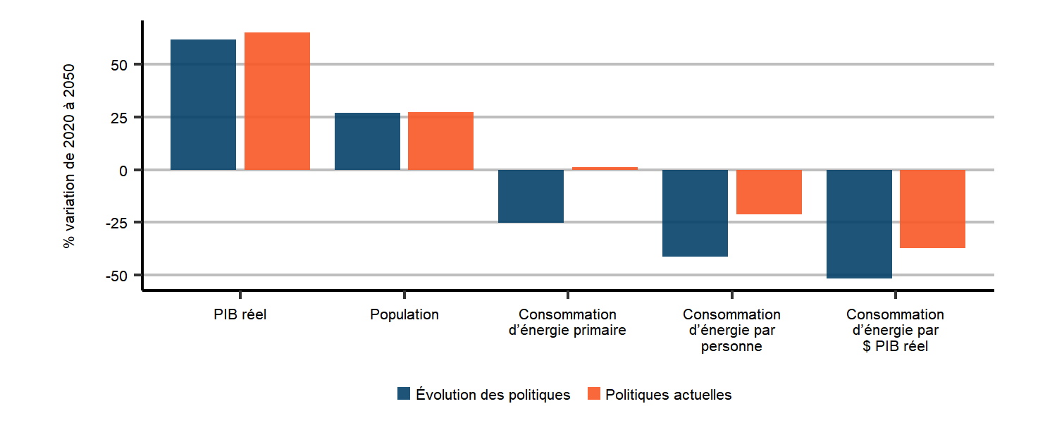 Description : Ce graphique présente l’évolution totale, en pourcentage, des variables macroéconomiques de 2020 à 2050 dans les deux scénarios. Dans le scénario d’évolution des politiques, le PIB réel augmente de 62 % et la population, de 27 %; la consommation d’énergie primaire diminue de 25 %, la consommation d’énergie par personne, de 41 % et la consommation d’énergie par dollar de PIB, de 52 %. Dans le scénario des politiques actuelles, le PIB réel augmente de 65 % et la population de 27 %; la consommation d’énergie primaire augmente de 1 %, la consommation d’énergie par personne, de 21 % et la consommation d’énergie par dollar de PIB, de 37 %.