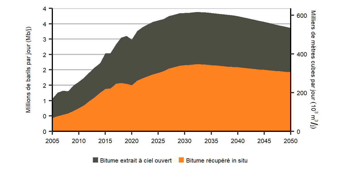 - La production de bitume par extraction à ciel ouvert, qui totalise 1,6 Mb/j en 2021, culmine à 1,7 Mb/j en 2024, puis recule à 1,4 Mb/j vers 2050.