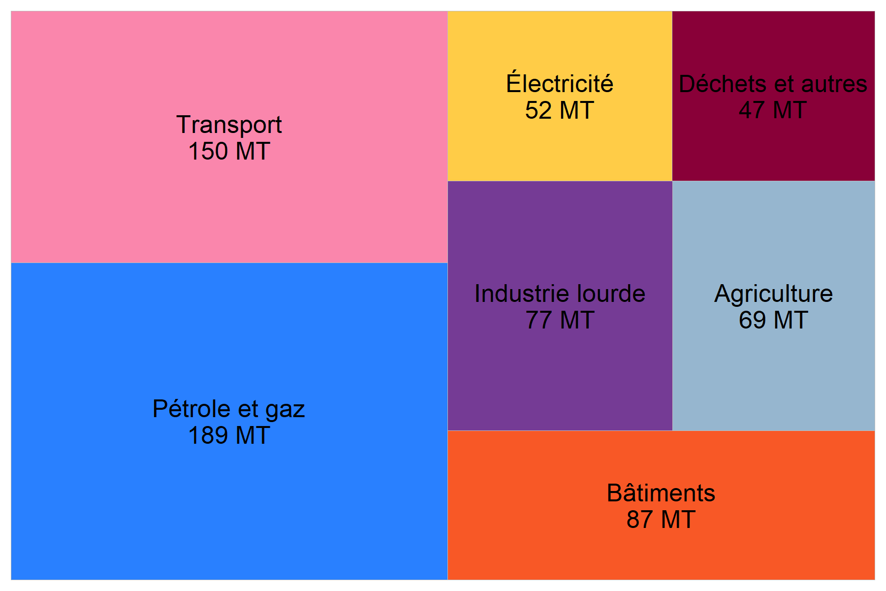 Description : Cette carte proportionnelle illustre la part relative des émissions de GES par secteur économique en 2021. Le secteur pétrolier et gazier a émis 189 MT, le transport 150 MT, les bâtiments 87 MT, l’industrie lourde 77 MT, l’agriculture 69 MT, l’électricité 52 MT et les déchets et autres 47 MT.