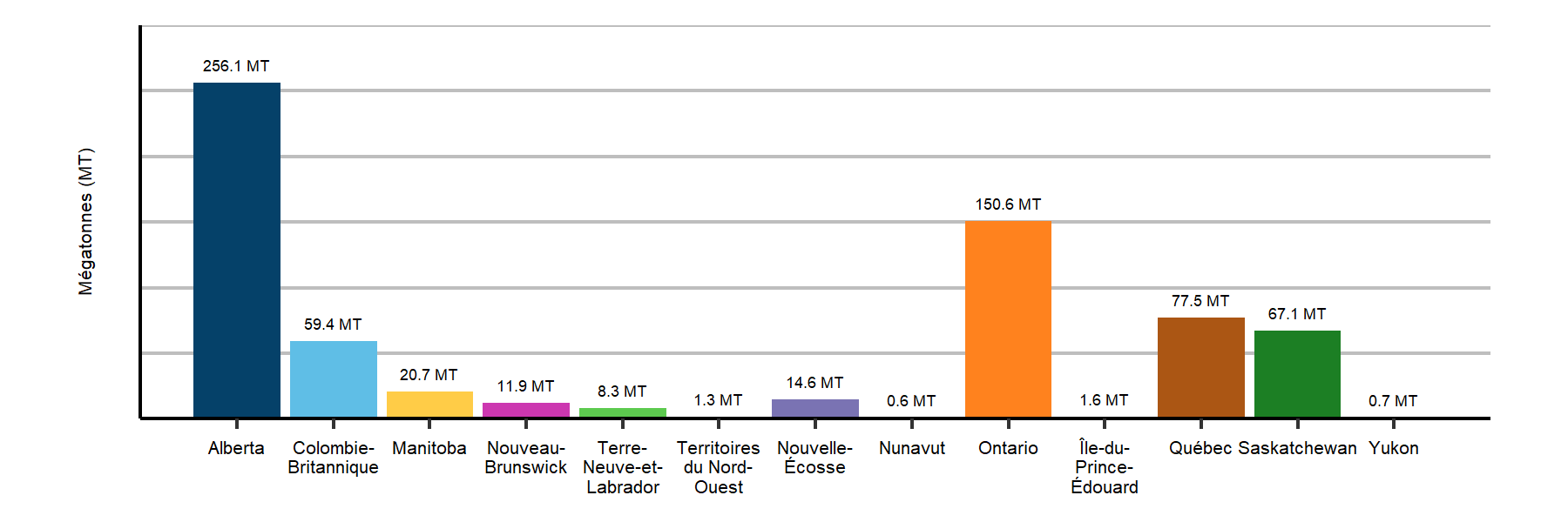 La province de l’Alberta affiche les volumes d’émissions les plus élevées, avec un peu plus de 250 Mt, suivie de l’Ontario, du Québec, de la Saskatchewan et de la Colombie-Britannique.