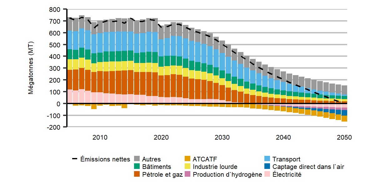 La figure montre que les émissions nettes diminuent graduellement pour atteindre le niveau zéro d’ici 2050. Le secteur des transports et celui du pétrole et du gaz affichent la plus forte baisse pendant la période de projection. Dans les années 2040, l’électricité, la production d’hydrogène et le captage direct dans l’air suivent l’ATCATF et deviennent des sources d’émissions négatives de plus en plus importantes.