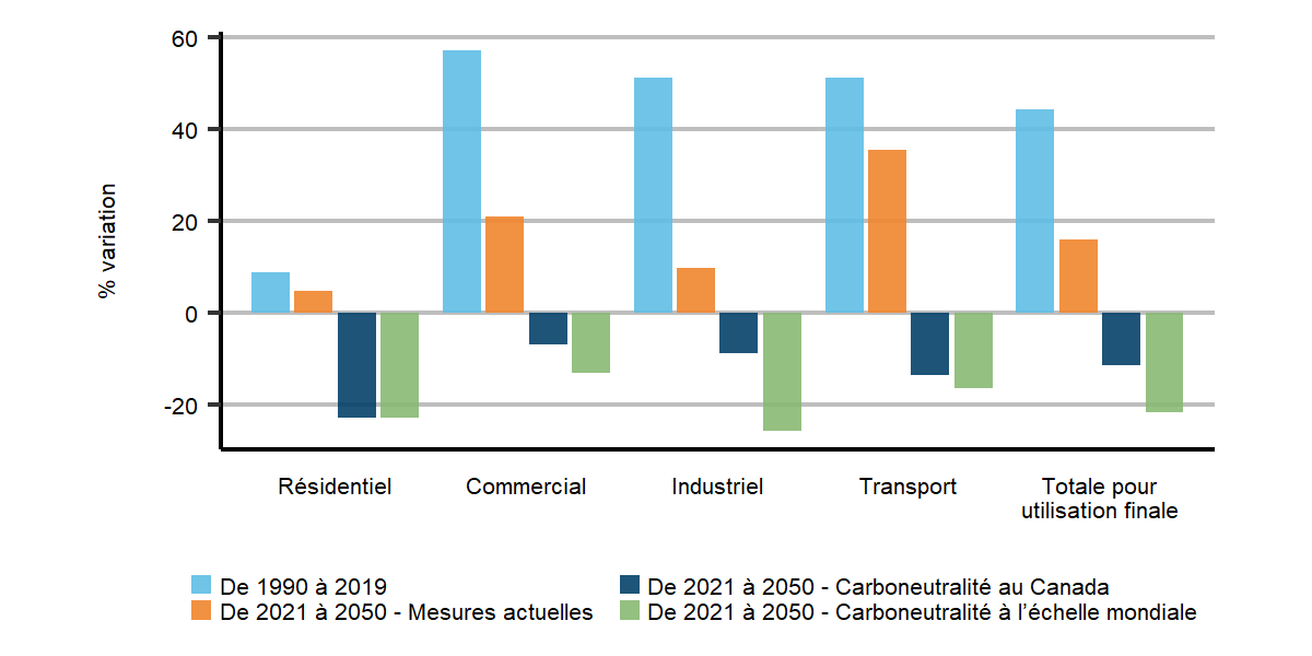 Description : Ce graphique à colonnes illustre la variation en pourcentage de la demande d’énergie pour utilisation finale par secteur de 2021 à 2050. Il compare la période historique de 1990 à 2019 aux trois scénarios prévisionnels pour la période de 2021 à 2050. Il s’agit des secteurs résidentiel, commercial, industriel et des transports.