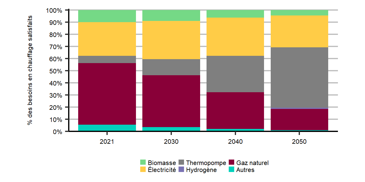 En 2021, le gaz naturel représentait environ 50 % de tout le chauffage résidentiel. Cette part diminue à moins de 20 % d’ici 2050 et est largement remplacée par une part croissante de thermopompes électriques.