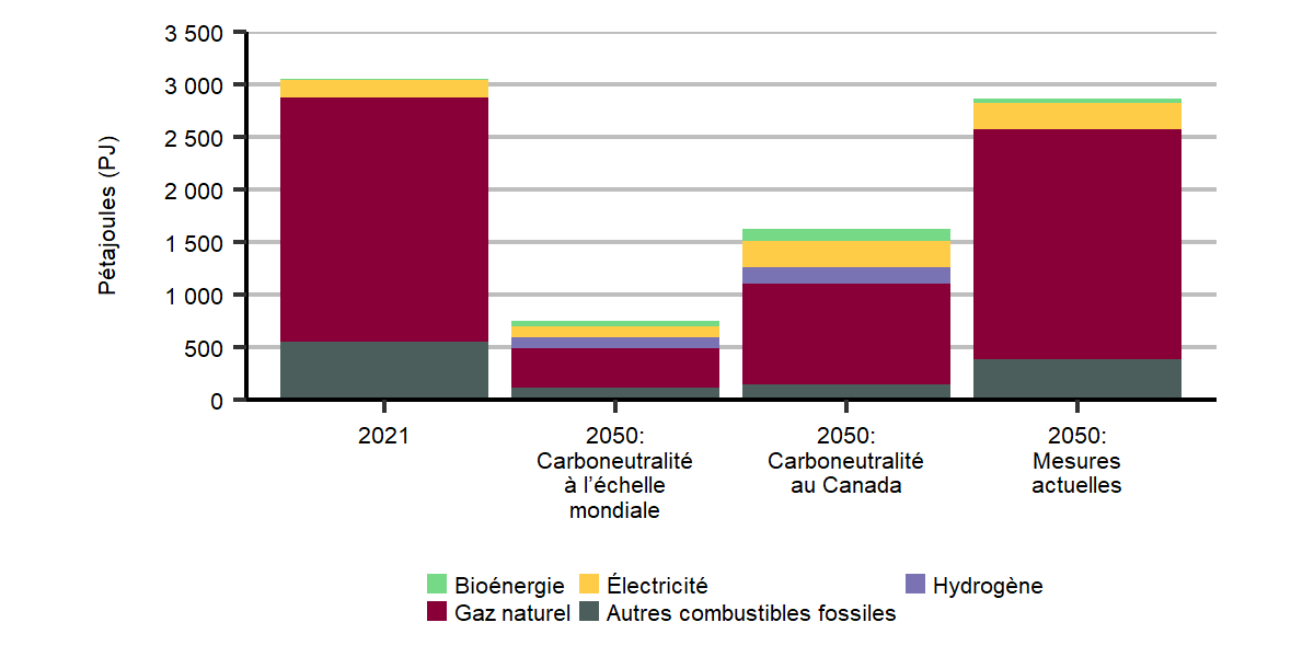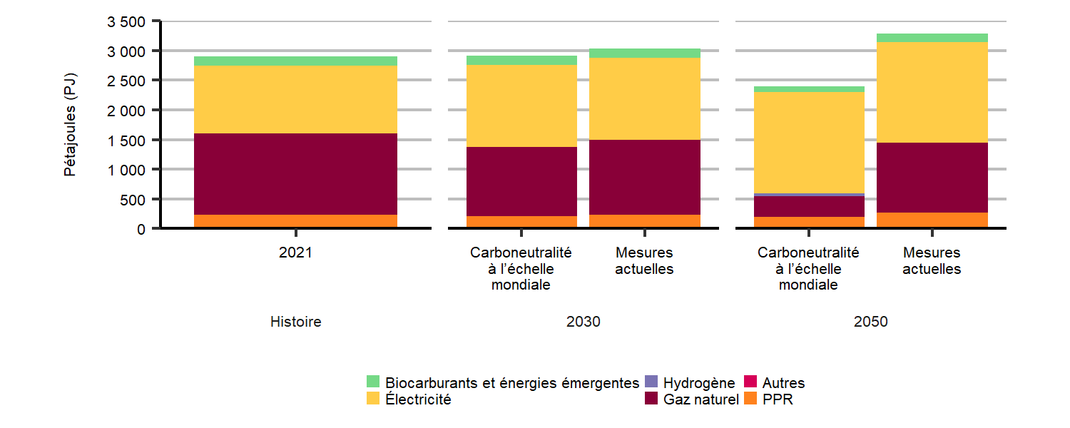 L’électricité et le gaz naturel ont été les principaux combustibles en 2021, et leur part demeure semblable dans le scénario des mesures actuelles pendant la période de projection. Le scénario de carboneutralité à l’échelle mondiale prévoit une diminution globale importante de la consommation d’énergie, attribuable en grande partie à une diminution de la consommation de gaz naturel, qui est graduellement remplacée par l’électricité.