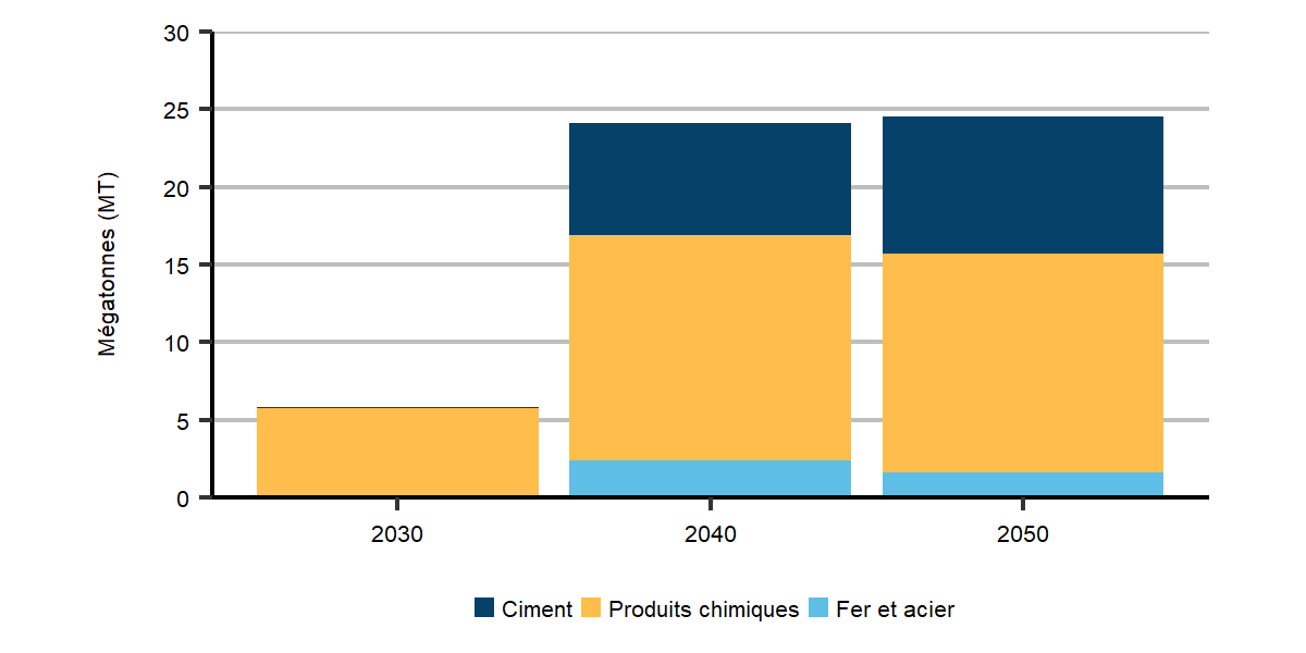 Description : Ce graphique à colonnes empilées illustre l’évolution des émissions sectorielles totales de GES dans le scénario de bilan zéro à l’échelle mondiale. Ces secteurs sont notamment l’électricité, la production d’hydrogène, le pétrole et le gaz, le captage direct dans l’air, l’industrie lourde, les bâtiments, les transports et l’ATCATF.