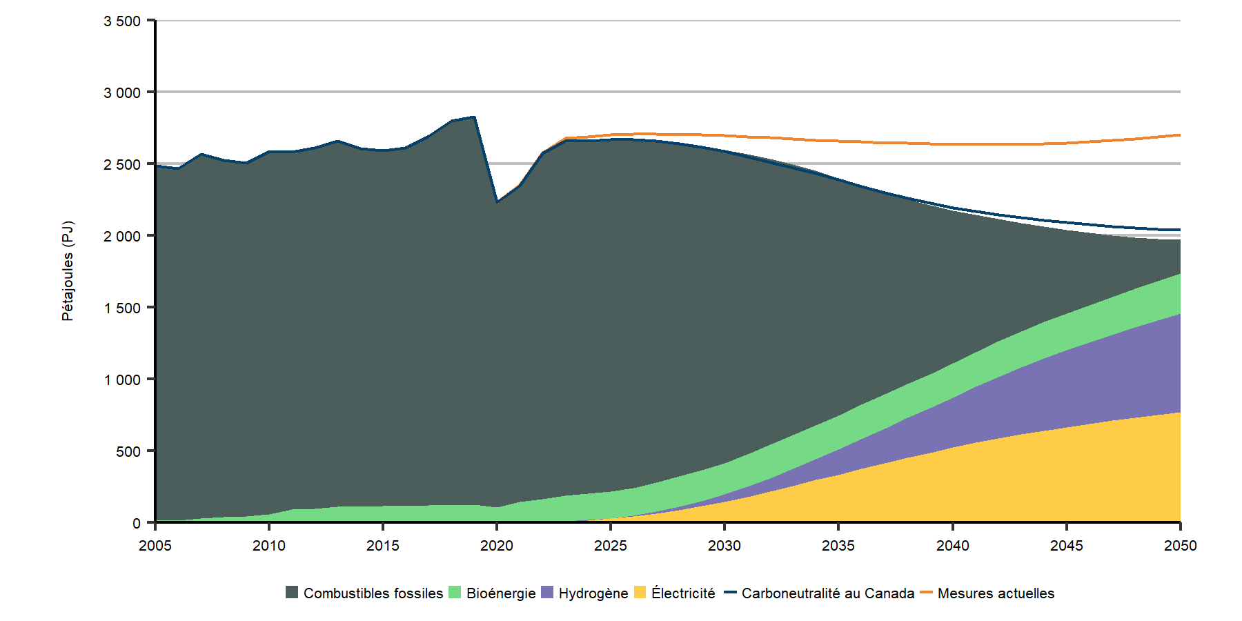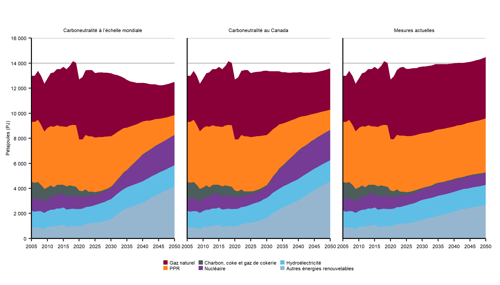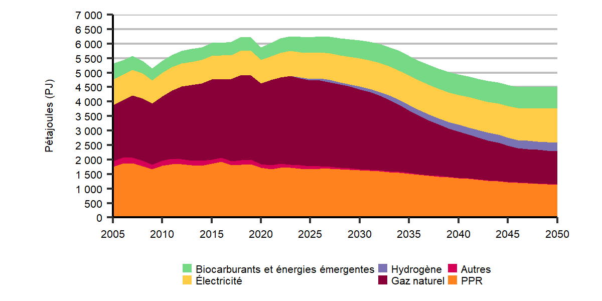 Dans le scénario des mesures actuelles, la consommation d’énergie est relativement stable jusqu’en 2040. Par la suite, la consommation d’énergie recommence lentement à augmenter. Cette hausse est attribuable au fait que les politiques climatiques ne se raffermissent pas au-delà de 2030, mais que l’économie et la population continuent de croître, ce qui fait augmenter la consommation d’énergie. La figure R.5 illustre l’évolution de la demande d’énergie pour utilisation finale dans chaque scénario.