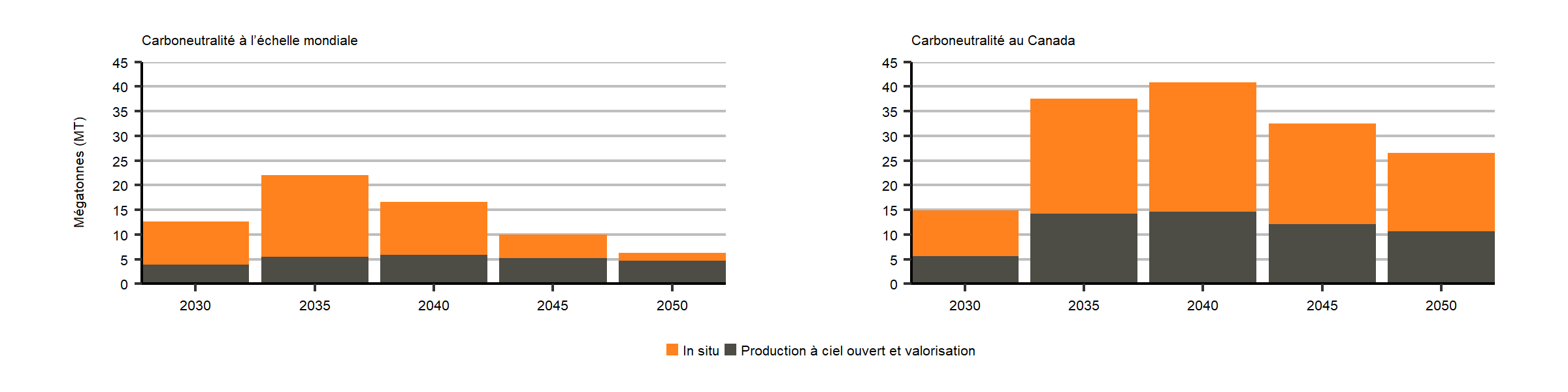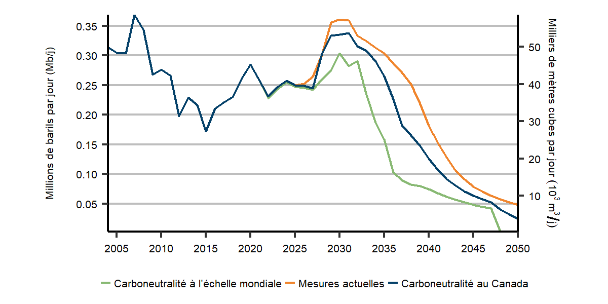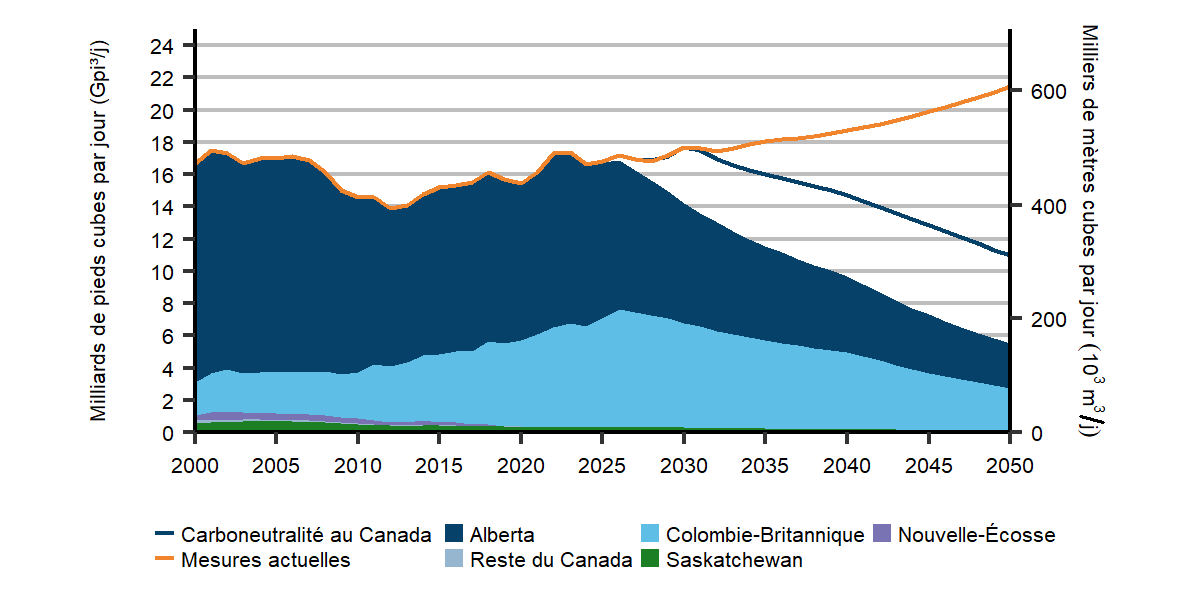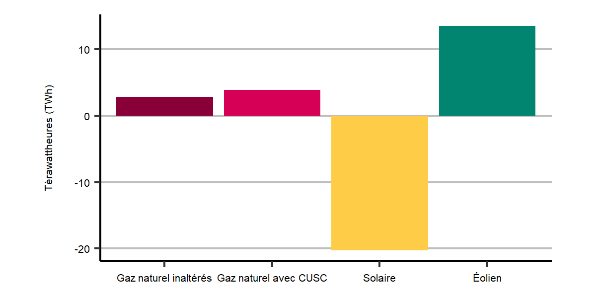 La production est légèrement plus élevée dans le scénario de carboneutralité du Canada en 2030 et 2050, avec une plus grande production de gaz naturel avec CUSC.