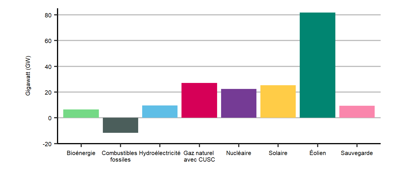 Apport des solutions fondées sur la nature – Dans notre analyse, nous avons limité l’apport des solutions fondées sur la nature pour nous intéresser davantage aux technologies énergétiques possibles pour atteindre la carboneutralité. Cependant, certaines études récentes sur la carboneutralité du Canada misent sur un plus grand apport du changement d’affectation des sols pour atteindre la carboneutralitéNote de bas de page 22. Les émissions ultimes dans ce domaine sont incertaines et pourraient être supérieures ou inférieures à celles de nos hypothèses.