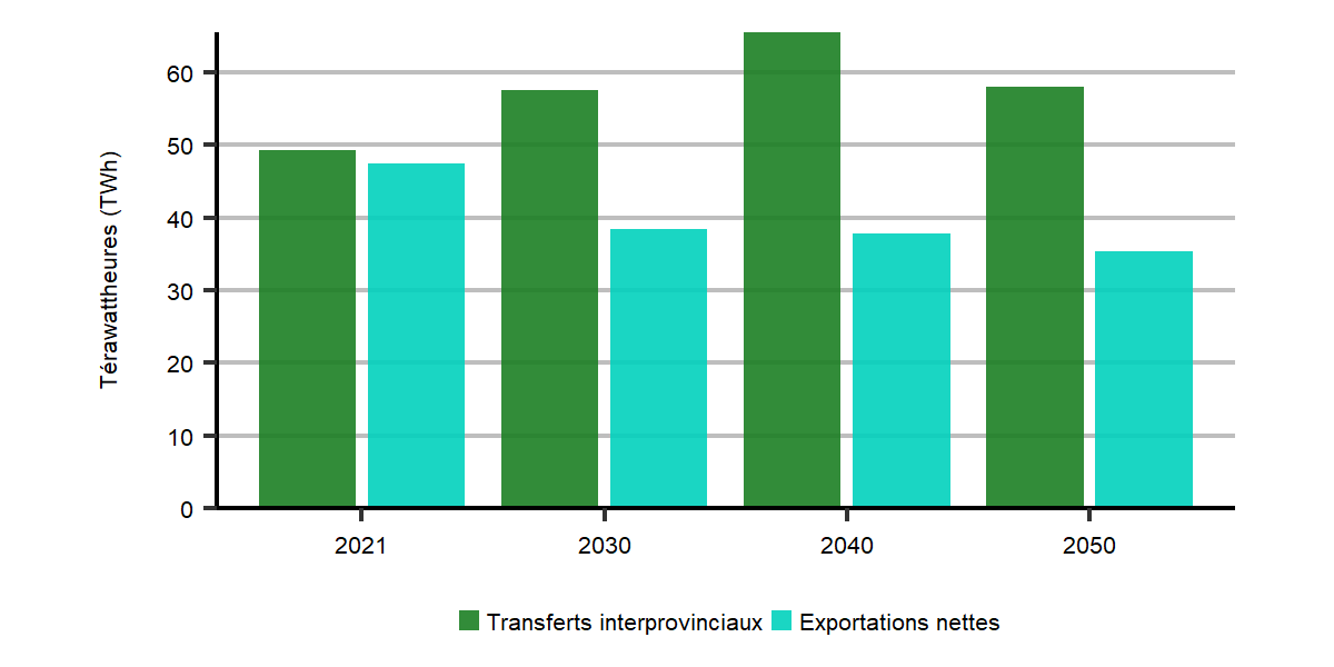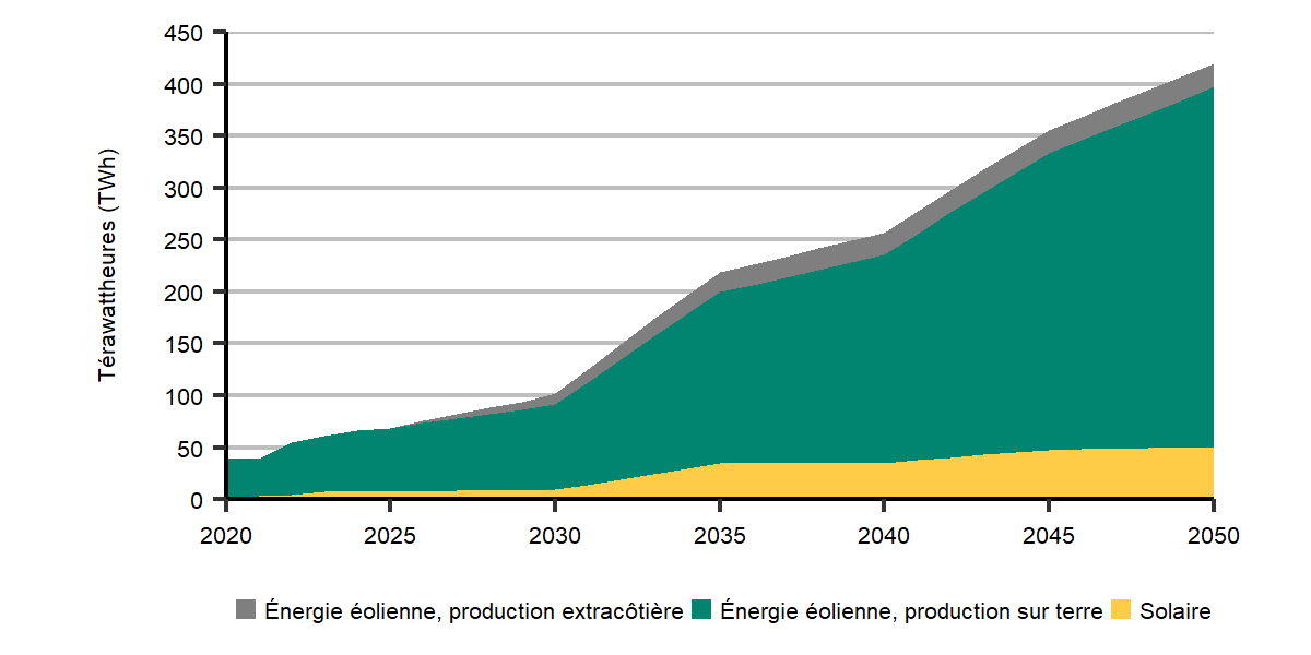 Exportations d’hydrogène – À l’heure actuelle, plusieurs projets de production d’hydrogène en vue de son exportation ont été proposés. Nos scénarios envisagent divers degrés de production d’hydrogène pour l’exportation, ainsi qu’une production d’énergie éolienne extracôtière pour rendre possible cette production. Or, les volumes d’exportation pourraient différer de ce que nous supposons selon l’évolution des marchés mondiaux et intérieurs.