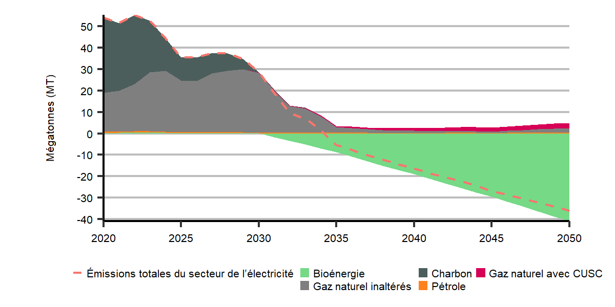 Équilibrage des émissions restantes par des émissions négatives compensatoires – Les émissions négatives par rapport aux émissions non captées dans nos scénarios concordent avec d’autres études canadiennes sur la carboneutralité. Dans l’éventualité où les progrès des technologies à émissions négatives seraient moins rapides que ce que nous entrevoyons, il serait nécessaire que d’autres secteurs de l’économie réduisent leurs émissions plus rapidement, ce qui pourrait exiger des politiques plus contraignantes. Par contre, si ces technologies se concrétisent plus rapidement, il est possible que de telles politiques ne soient pas nécessaires pour parvenir à la carboneutralité.