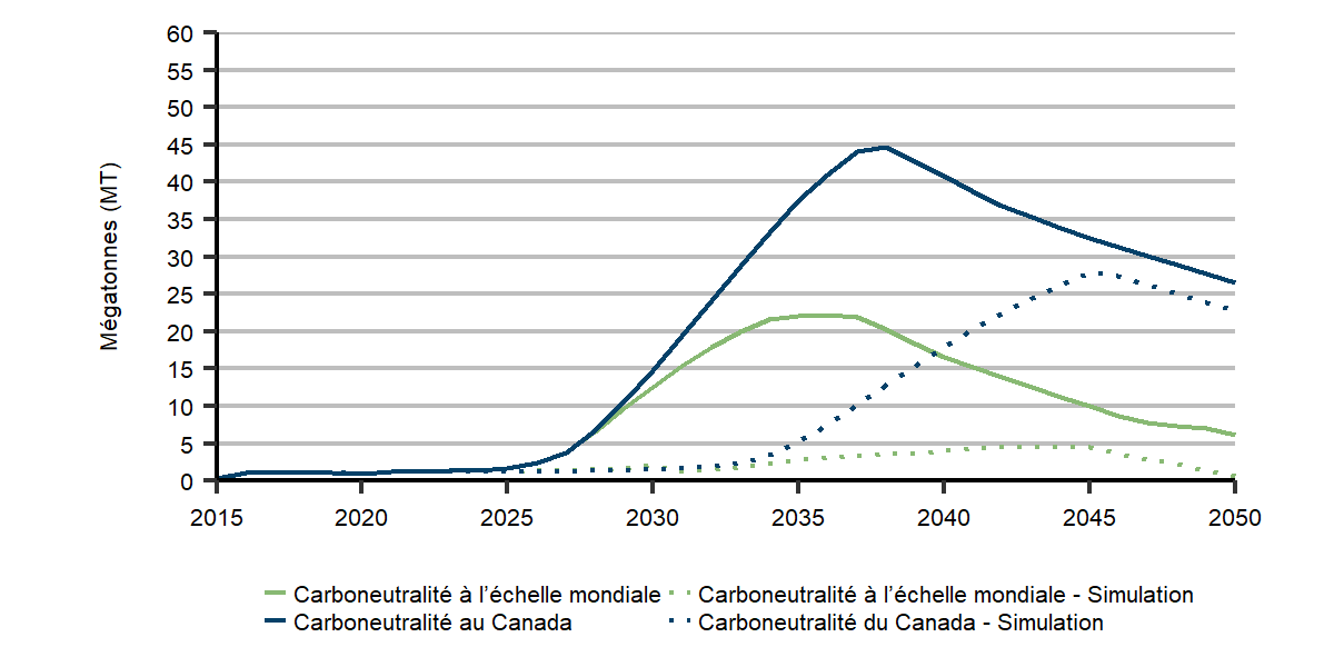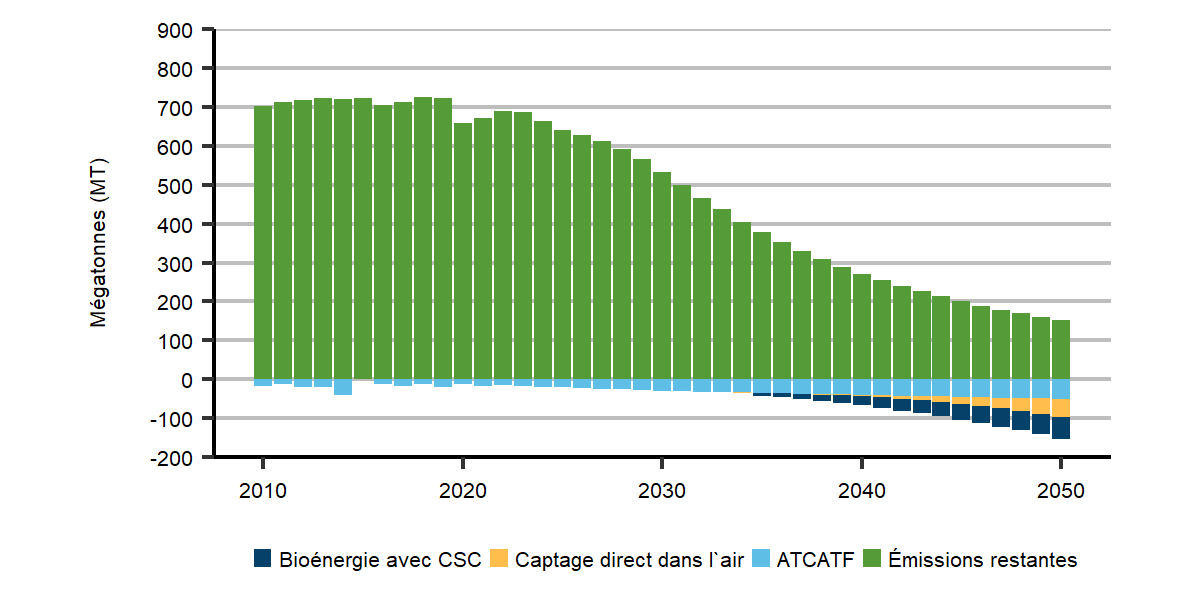 Dans le scénario de carboneutralité à l’échelle mondiale, nous projetons que des installations de CDA entreront en service à la fin des années 2030 et qu’à l’horizon 2050, les émissions négatives provenant de cette technique s’élèveront à 46 Mt. Dans le scénario de carboneutralité du Canada, ces installations captent 55 Mt d’émissions vers 2050; aucune installation du genre n’est aménagée dans le scénario des mesures actuelles.