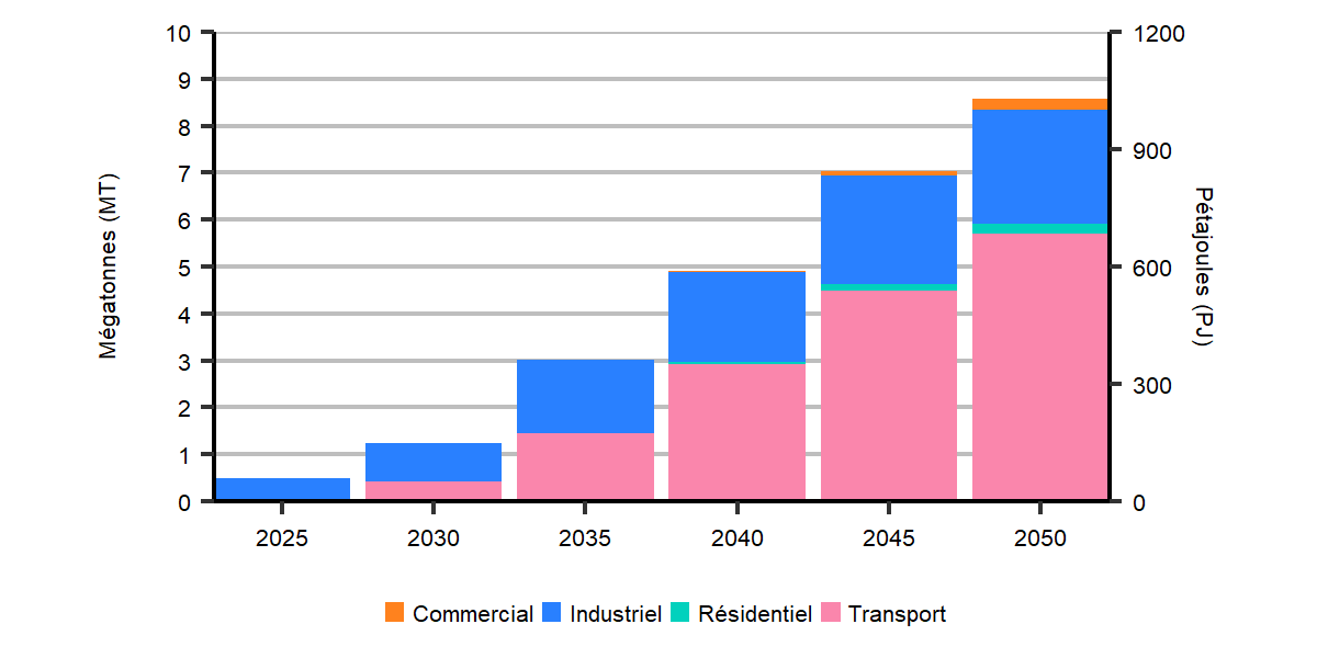 L’hydrogène est un combustible polyvalent qui joue un rôle de premier plan dans le bouquet énergétique du Canada dans le scénario de carboneutralité à l’échelle mondiale. Parallèlement, son adoption au Canada et le développement de marchés d’exportation pour l’hydrogène canadien demeurent incertains. Les simulations laissent entrevoir une foule de degrés dans la demande d’hydrogène au Canada et révèlent que son utilisation a de grandes répercussions sur l’évolution d’autres produits énergétiques, notamment l’électricité et le gaz naturel.