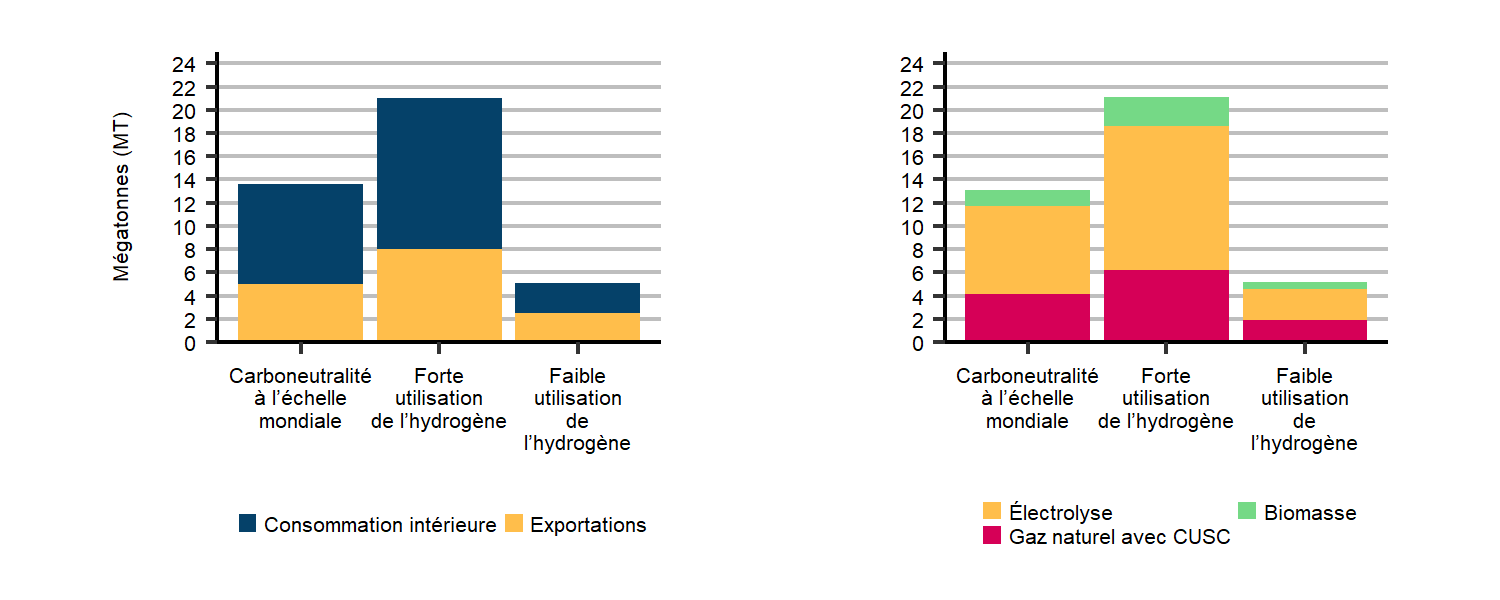 Les résultats de cette simulation donnent à penser qu’il existe toute une plage d’intensités possibles d’utilisation d’hydrogène dans les années à venir. La simulation de faible utilisation de l’hydrogène laisse entrevoir un avenir où celui-ci occupe une place moins importante dans l’atteinte de la carboneutralité du Canada d’ici 2050. Celle dans laquelle l’hydrogène est fortement utilisé dépeint un avenir où il est appelé à jouer un plus grand rôle dans l’atteinte de la carboneutralité. La figure R.41 compare l’utilisation et les exportations d’hydrogène, ainsi que la technologie employée pour le produire, dans les cas d’une faible et d’une forte utilisation de l’hydrogène et dans le scénario de carboneutralité à l’échelle mondiale. En 2050, dans la simulation d’une faible utilisation de l’hydrogène, la demande et les exportations s’élèvent à 5 Mt, soit 60 % de moins que dans le scénario de carboneutralité à l’échelle mondiale. Quant à la simulation de forte utilisation de l’hydrogène, elle dénote une demande et des exportations s’élevant à 20 Mt, c’est-à-dire 55 % de plus que dans ce même scénario de carboneutralité à l’échelle mondiale.