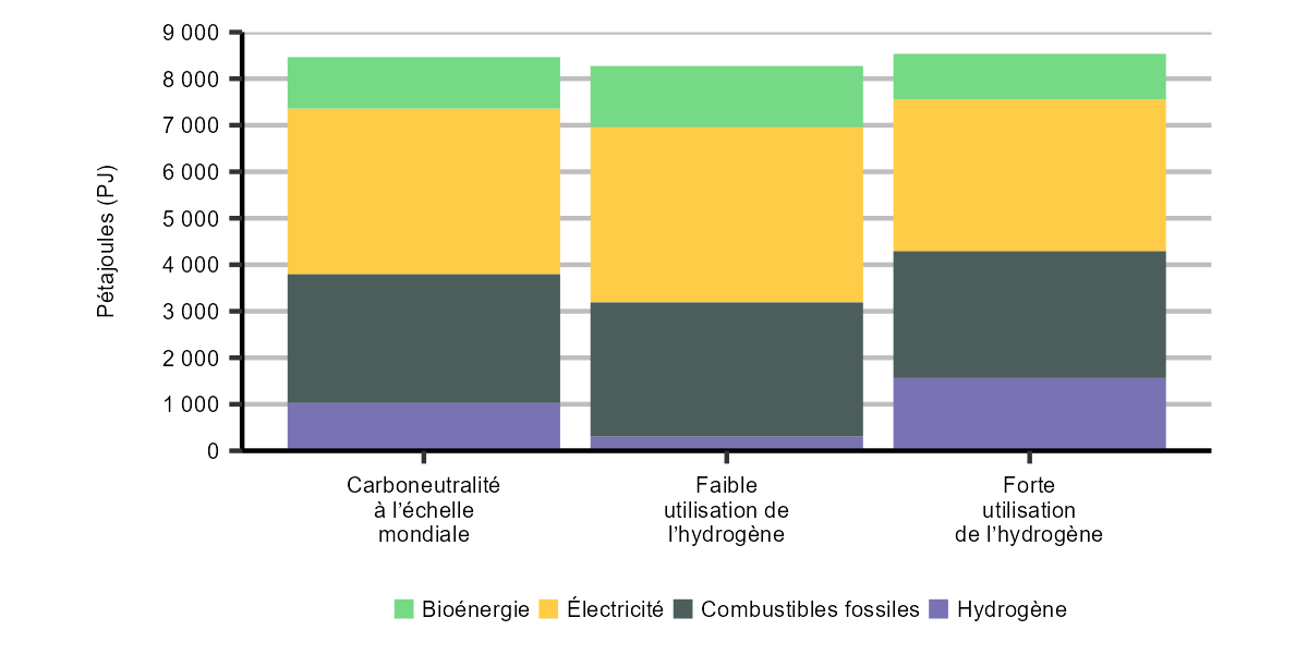 Description : Ce graphique à colonnes empilées illustre la demande totale d’énergie pour utilisation finale dans le scénario de carboneutralité à l’échelle mondiale et les simulations de forte et de faible utilisation de l’hydrogène en 2050. La demande totale d’énergie est ventilée par source de combustible, y compris la bioénergie, l’électricité, les combustibles fossiles et l’hydrogène.